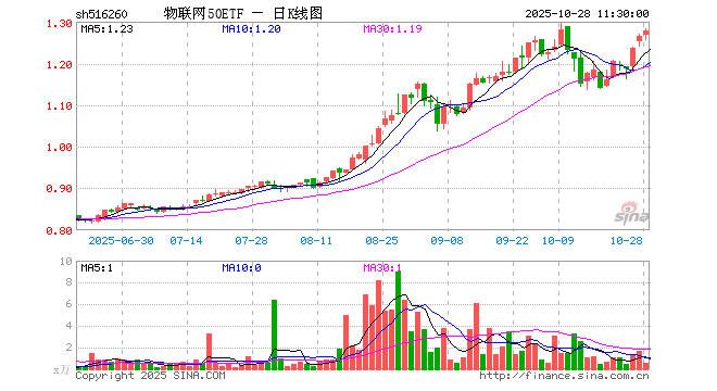 10月28日,截止午间收盘,物联网50ETF(516260)涨1.11%,报1.279元,成交额71.68万元。物联网50ETF(516260)重仓股方面,立讯精密截止午盘涨0.08%,中际旭创涨3.81%,汇川技术涨0.23%,豪威集团涨3.09%,中兴通讯跌2.40%,美的集团跌0.49%,科大讯飞涨2.23%,海康威视跌1.39%,海尔智家跌1.04%,兆易创新涨1.94%。