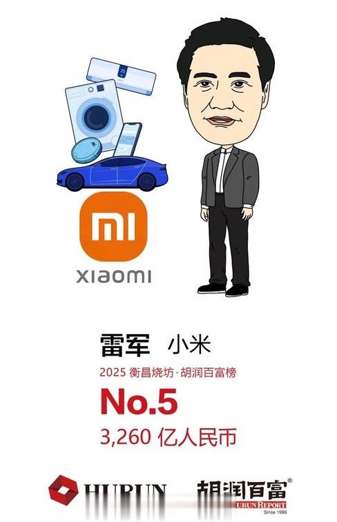 雷军以3260亿元排名第五,上升14位,据了解,这是雷军自2015年后时隔十年第二次闯进前五。据了解,雷军财富的增长,主要得益于小米汽车业务的爆发式增长和手机高端化突破带来的盈利跃升。