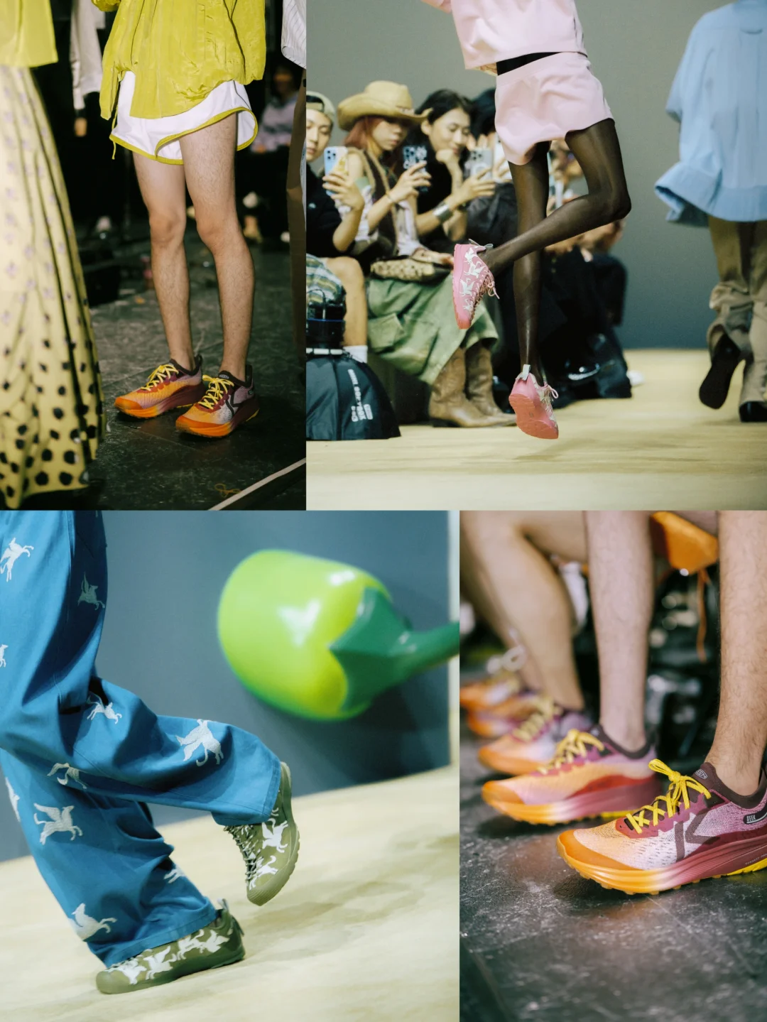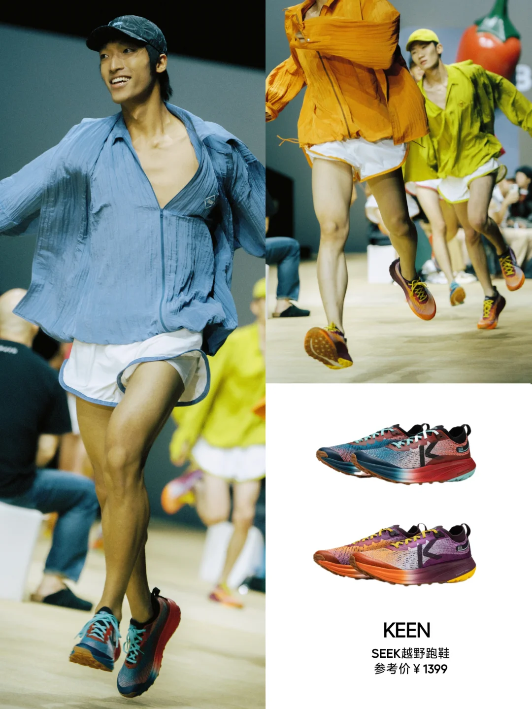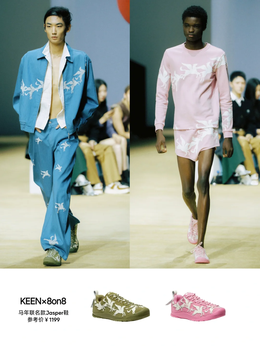 8on8昨晚那场奔跑的秀太欢乐了吧,模特们以奔跑的形式入场,简直不要太松弛了,而秀场中模特们上脚的keen与8on8马年联名款鞋也格外吸睛,苔藓绿和雾霾粉两个配色,复古又明亮,鞋面上的飞马图案生动又特别,这波跨界联名真的狠狠期待了~还有奔跑中模特穿的seek越野跑鞋,和现场氛围也好搭!