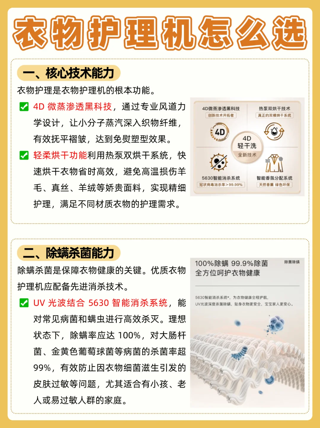 UV 光波 + 5630 智能消杀系统加持,杀菌率能够达 99.9%,除螨率 100%,中国家电院认证的母婴级衣物护理机。强力消灭常见病菌螨虫,为敏感肌肤人群和婴幼儿衣物健康保驾护航。