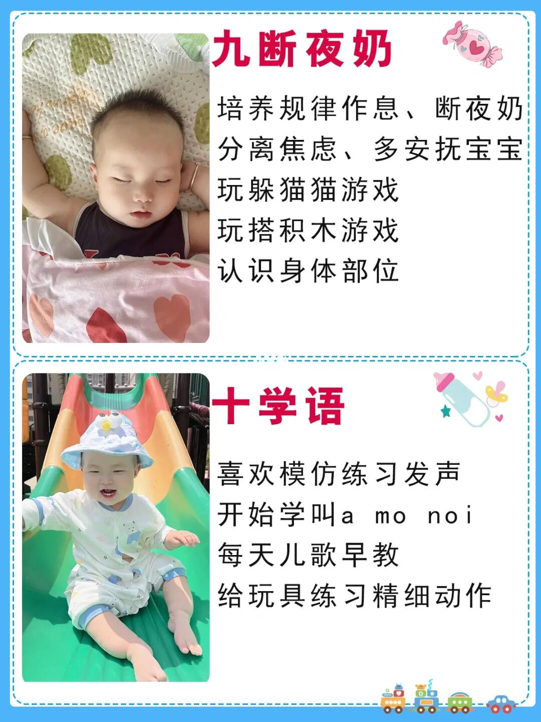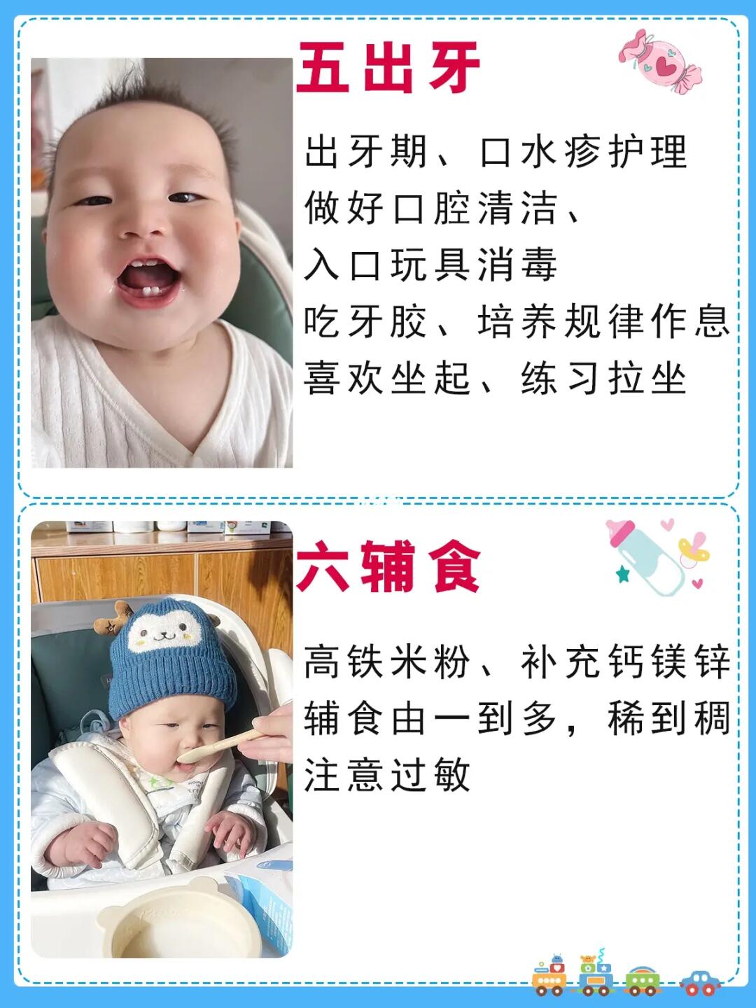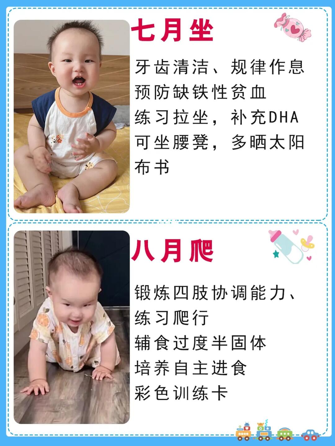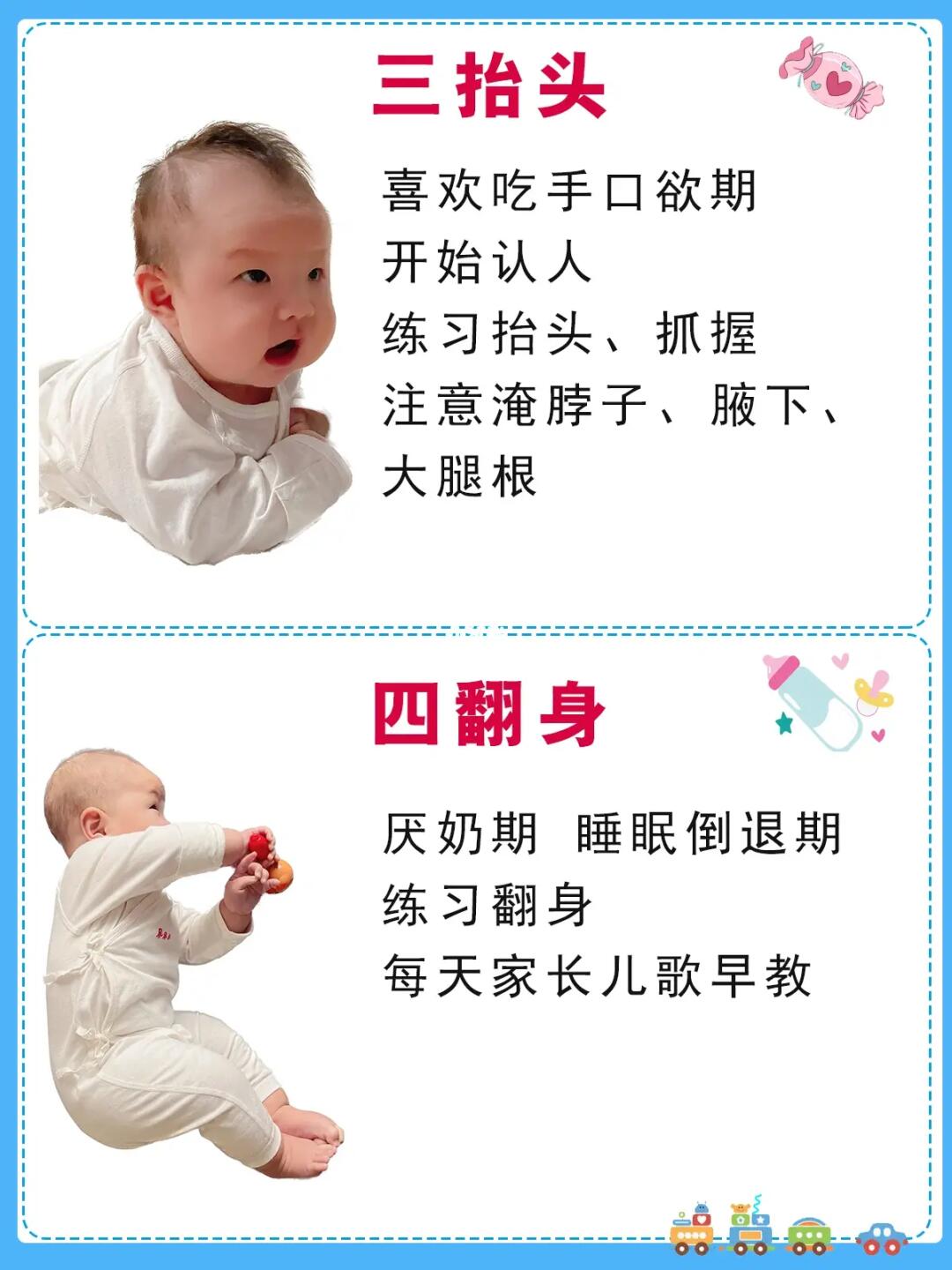 一月睡,二月闹,三抬头,四翻身,五出牙,六辅食,七月坐,八月爬,九断夜奶,十学语,十一站,十二走