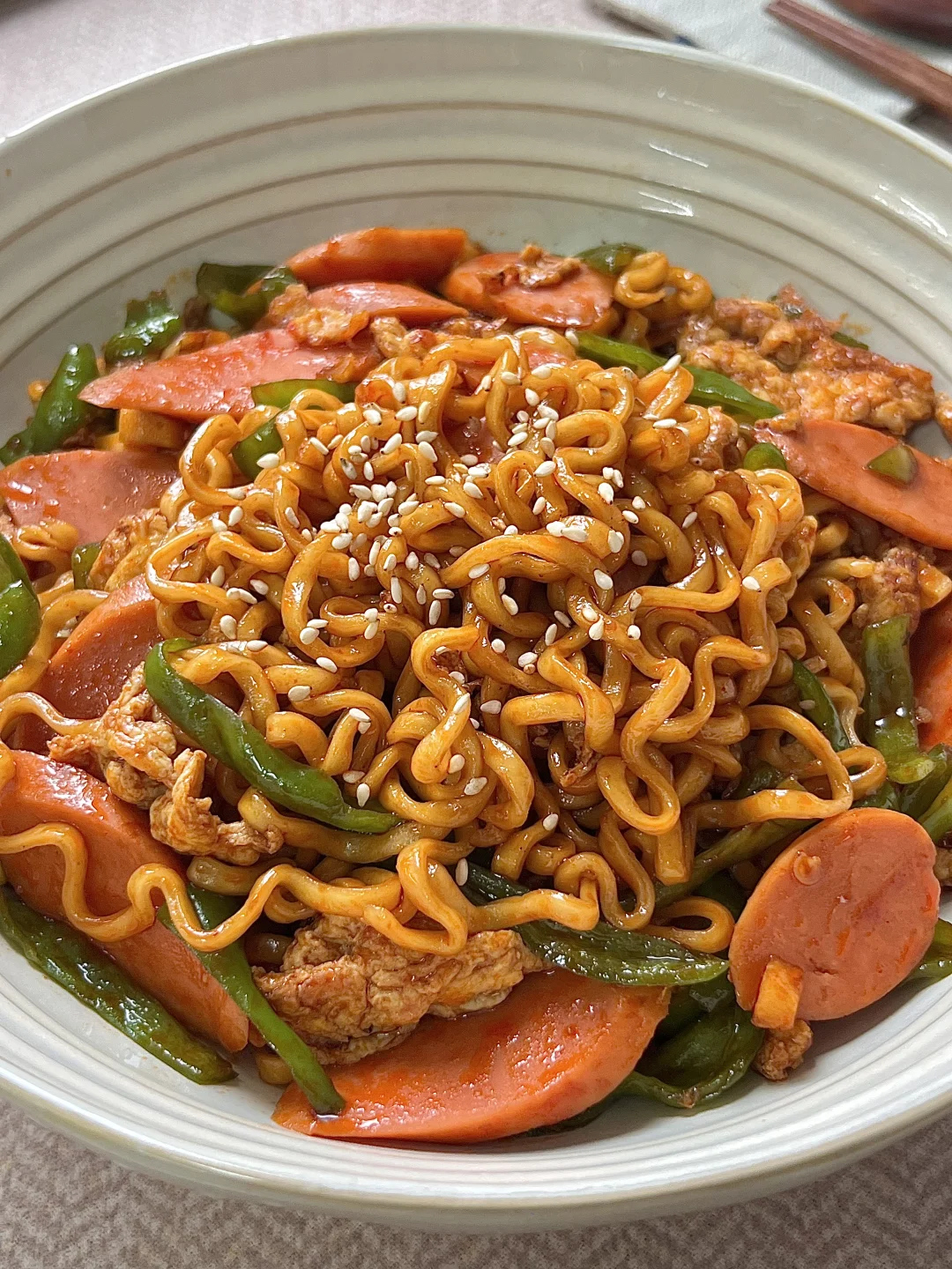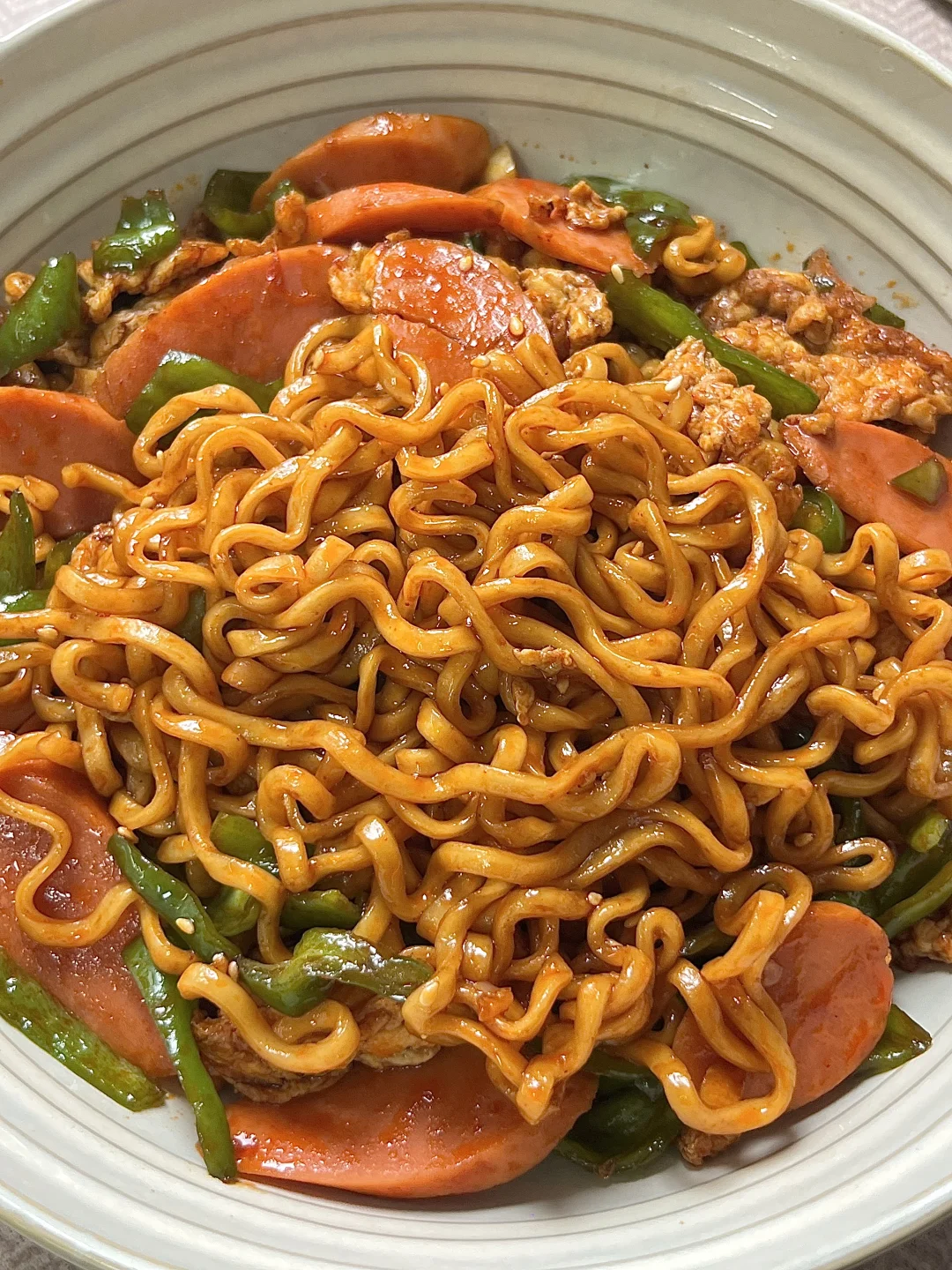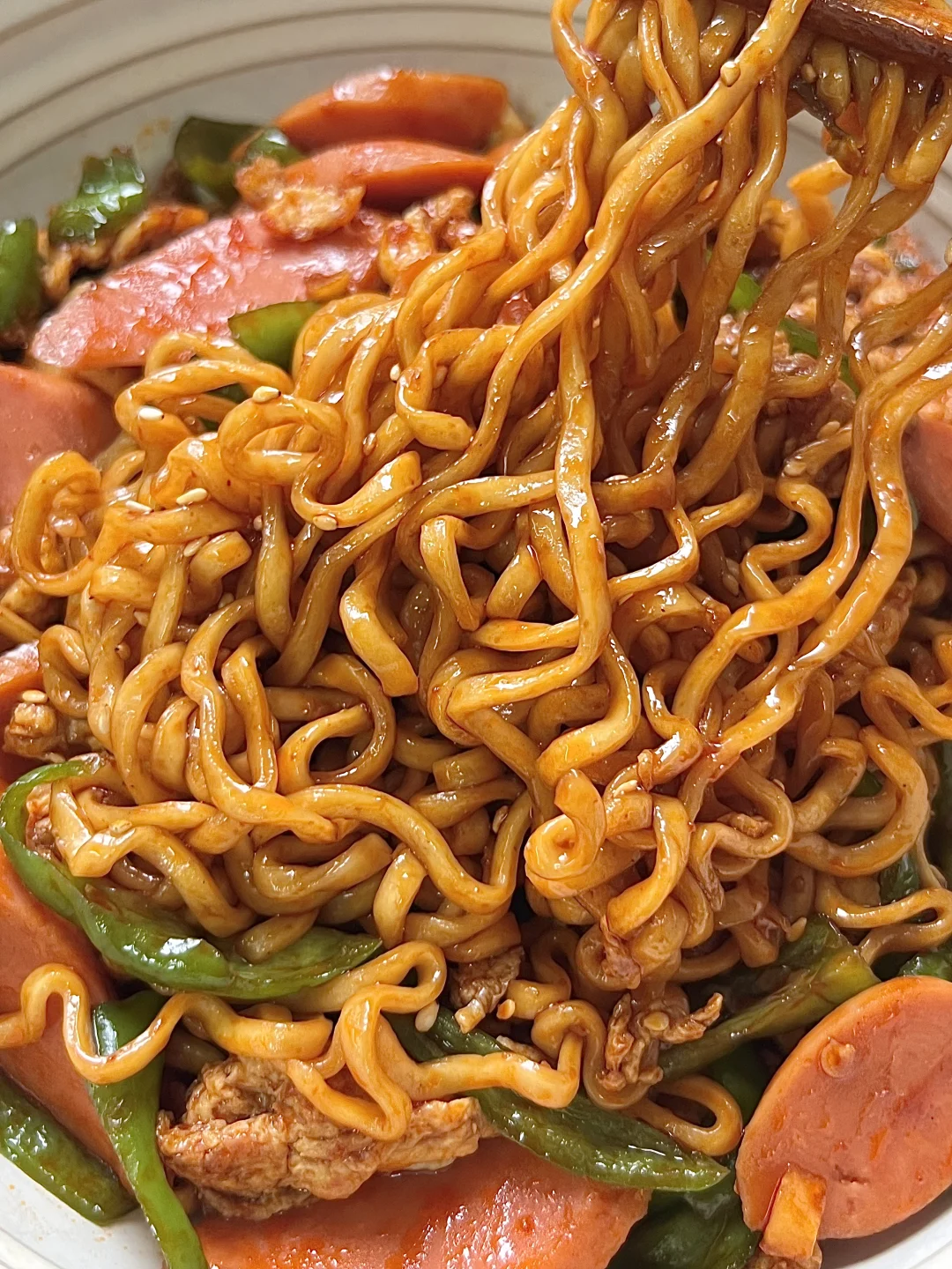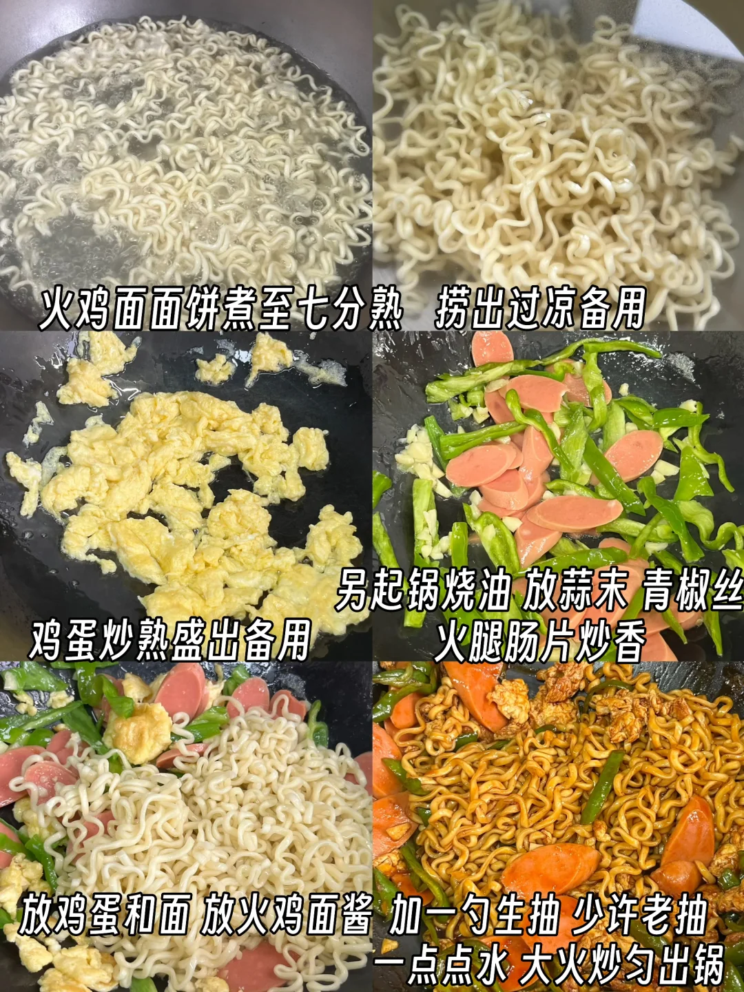 附做法: 1️⃣火鸡面煮至七分熟捞出,过凉备用;起锅烧油,鸡蛋炒熟盛出 2️⃣另起锅烧油,放蒜末、青椒丝、火腿肠片炒香;再放面和鸡蛋,下火鸡面酱料包 3️⃣再加一勺生抽、少许老抽、一点水,大火炒一下出锅✅ -