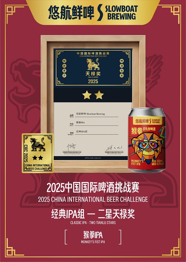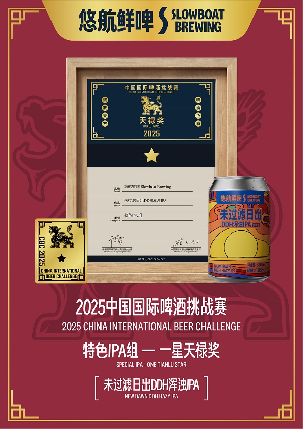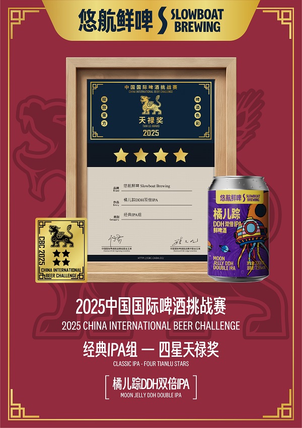 中国精酿领域的领军品牌之一悠航鲜啤,近日在刚刚落幕的2025年度中国国际啤酒挑战赛(CBC)天禄奖评选中,其旗下四款精心酿造的啤酒从众多参赛酒款中脱颖而出,勇夺四项大奖。其中,「橘儿踪DDH双倍IPA」凭借其卓越的品质,斩获大赛四星奖;「猴拳IPA」荣获二星奖;同时,「曹台班子IPA」与另一款酒「未过滤日出DDH浑浊IPA」双双摘得一星奖。此次获奖,是行业权威机构对悠航鲜啤不懈追求酿造技艺与极致风味的又一次高度肯定。