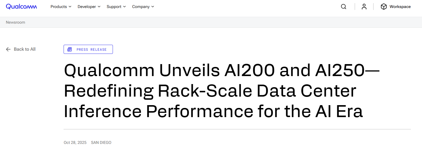 值得注意的是,高通已与沙特阿拉伯公共投资基金旗下AI公司HUMAIN达成合作,双方将于2026年起开始部署总容量达200兆瓦的高通AI200和AI250机架解决方案。