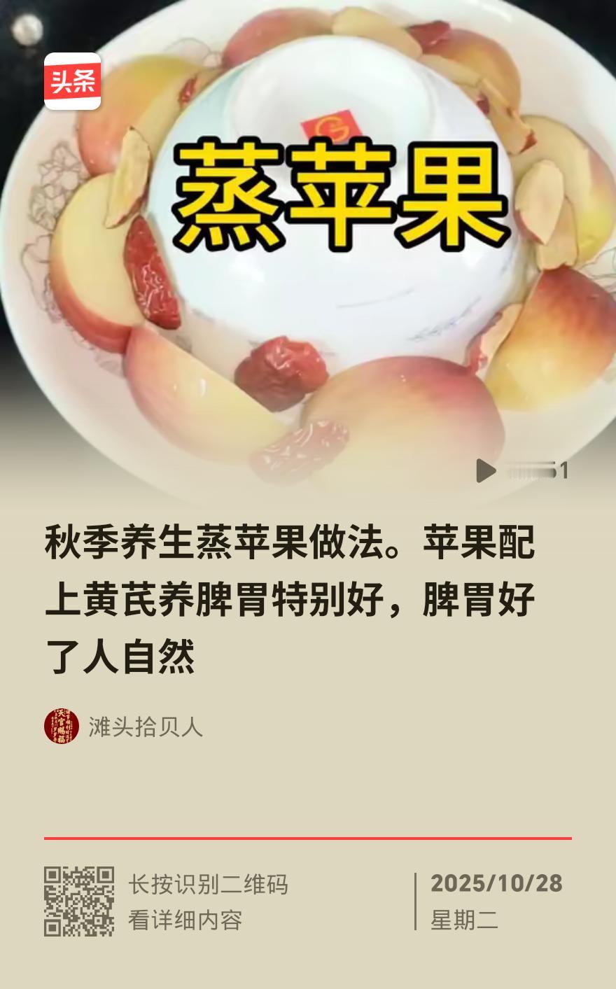 秋冬养生别瞎花钱!苹果加它煮水,比奶茶管用10倍,对症喝太舒服 秋冬一到就被口干、胃寒、积食缠上?别再瞎买养生茶了!最近“苹果煮水”爆火,就用家里现成的食材搭一搭,比啥补剂都接地气,成本几毛钱就能搞定。 苹果这玩意儿真是“养生万金油”,生着吃脆爽,煮完更温和,连肠胃弱的老人小孩都能喝。关键是搭配不同食材,效果完全不一样,跟“开盲盒”似的精准对症。 胃寒星人直接冲苹果生姜水,苹果切块丢两三片生姜煮15分钟,加勺红糖,喝完整个人从胃暖到脚尖,吃凉的再也不怕反酸。气血虚总犯困的,苹果配3颗红枣煮20分钟,枣香混着果香,比奶茶健康还解馋。 盯手机眼睛干涩的,苹果煮10分钟再放枸杞,多煮一秒都浪费营养;吃多了油腻积食?苹果加山楂煮15分钟,酸甜口解腻又消食,堪称“大餐救星”。秋冬干燥嗓子痒,就用苹果配银耳百合,煮到银耳出胶,润得不行。 不过得提醒句,红枣、山楂含糖不低,糖友得少放。煮好的水当天喝完,别放过夜。这玩意儿就是日常调理,真生病还得看医生。 就这么个普通苹果,换着花样煮水喝,比买几百块的保健品实在多了。天冷煮一杯暖乎乎的,身体舒服还省钱,赶紧回家试试!苹果 苹果煮水喝