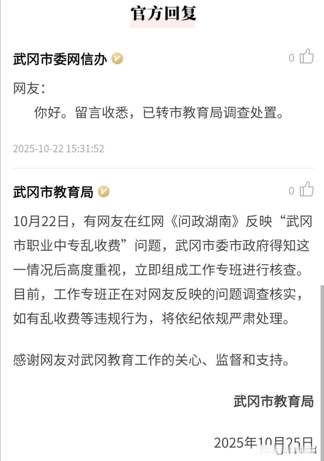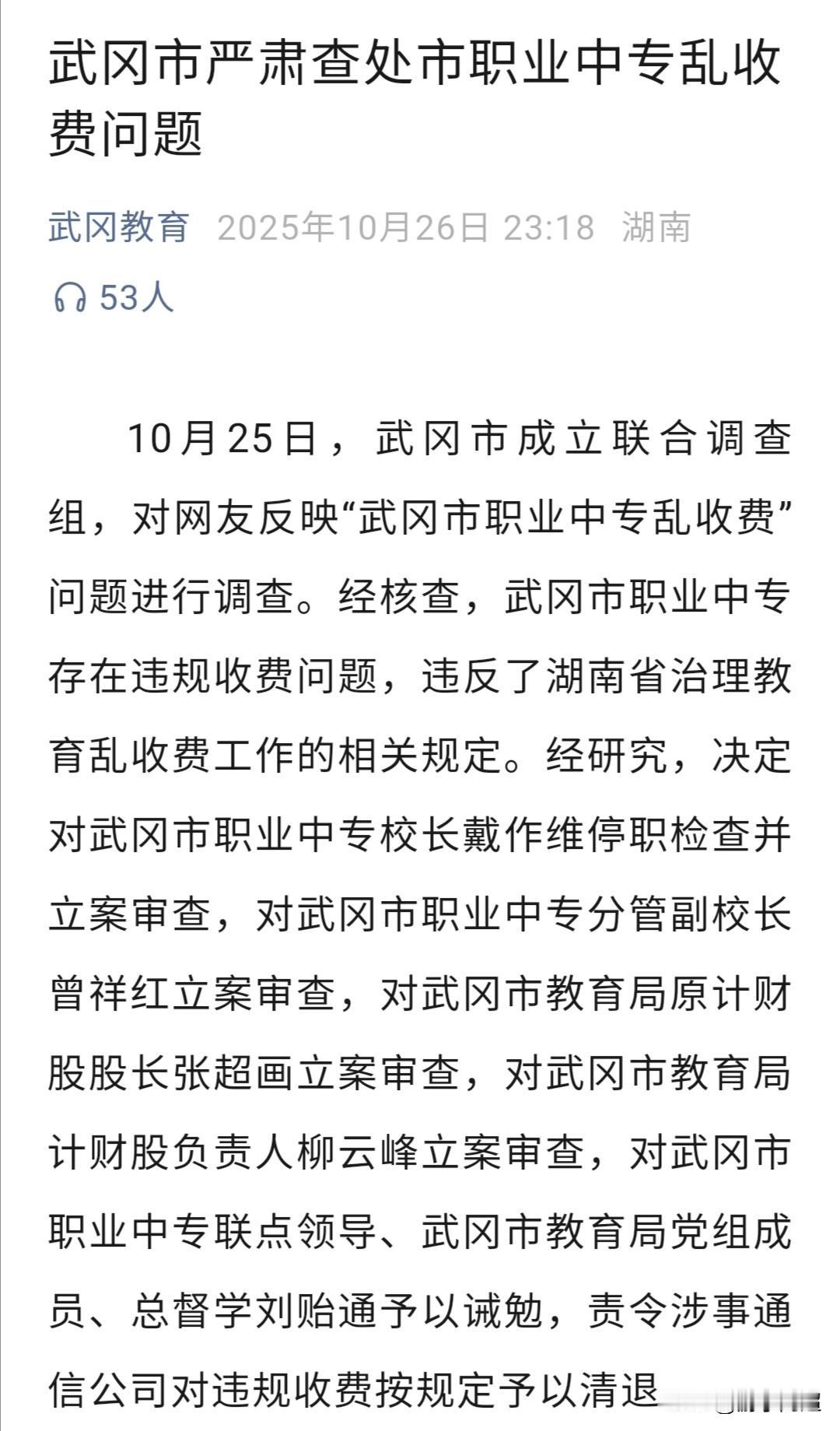 近日,有人在湖南问政平台投诉武冈市职业中专存在乱收费问题,官方给出的处理结果令人满意。 10月22日,有人在问政平台反映武冈市职业中学“智慧校园系统”收费不合理,10月25日,武冈市教育局迅速组建工作组展开调查。 经核查,投诉情况属实,随即对当事人进行实名通报并立案审查。 武冈市教育局如此快速且果断的处理方式,在整个邵阳市都较为少见。 学校本应是教书育人之所,而非借课后服务费、资料费、学位费等名目,通过各种途径敛财的“生意场”。为武冈市教育局点赞!