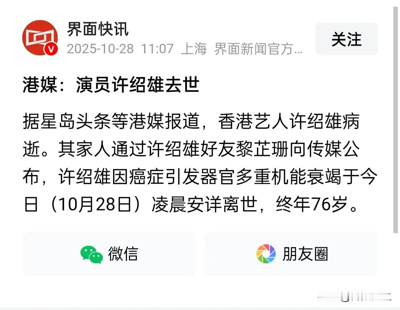 76岁的“欢喜哥”许绍雄走了, 不是因为年龄大, 也不是因为贫穷,更不是因为爱情,而是因为生命的自然规律带走了他。 《信息来源:界面快讯》 就在今天凌晨,许绍雄在医院因病去世了。 他扮演过很多角色,《鬼马双星》里的小迷糊,还曾参演过《射雕英雄传》妙手书生朱聪,还有《使徒行者》里饰演覃欢喜,人称“欢喜哥”,《暗战》里扮演刘青云的上司黄启法,还凭这个角色,获得了第19届香港电影金像奖最佳男配角提名。 他扮演了那么多角色,却让人没有想到,他突然间因着疾病离开了我们。 感谢许绍雄在荧幕上给我们塑造了这么多经典角色,斯人已去,经典永存。 希望欢喜哥一路走好![蜡烛][蜡烛][蜡烛]