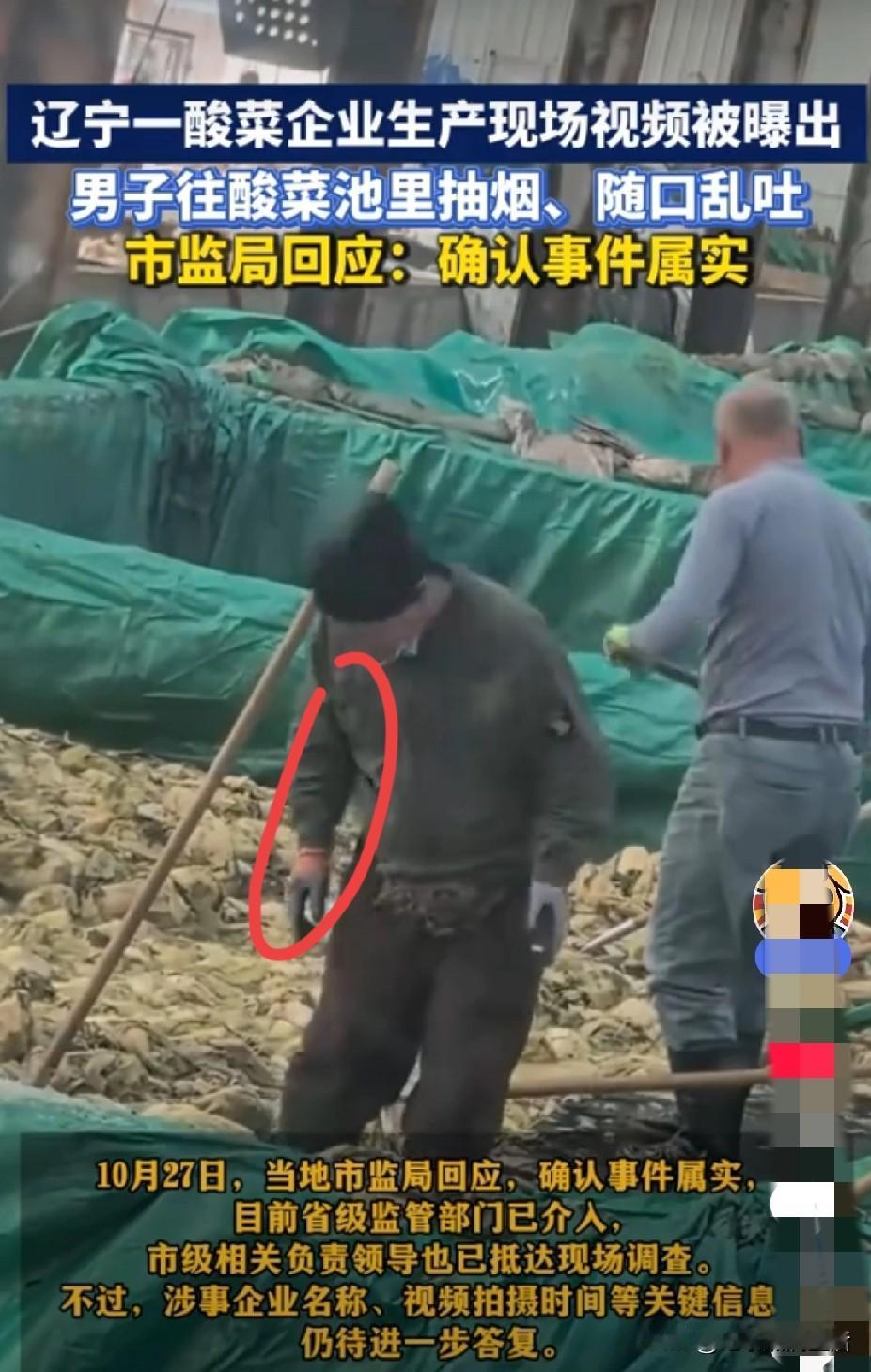 葫芦岛酸菜大叔这事儿,被曝光已经不是第一次了。 2022年的时候,315就专门报道了一家酸菜生产企业,所涉及的卫生问题,和今天辽宁的几乎是如出一辙。 在很早以前就有视频曝光一些酸菜生产企业,在农田里直接挖一个大坑,铺上塑料布露天发酵,而那些工人更是赤脚上去摆放、踩压,也没有穿任何的防护服,在这期间也不进行有效的覆盖,上面一层满是灰尘和树叶草叶的,等酸菜腌制好了以后,直接是挖掘机上去装车,不但让人看得头皮发麻,更是让人作呕。当然这个事情已经过去很多年了,当时也是轰动全国,很多人可能都已经忘记了。 最近的一次就是那个插旗菜业,给很多方便面企业供应老坛酸菜,也是曝光出,工人在制作过程中,没有任何的防护措施,还在菜缸里吸烟。被315报道后,各个方便面企业,也是惊出了一身冷汗。 没想到这才过去3年,在酸菜的主产地东北,又发生了如此恶劣的事情,不但吸烟,还把几十年的浓痰吐到酸菜里面。 与其说这个大叔是酸菜行业的老鼠屎,不如说这家企业根本就没有把食品安全放在心里,这样的事情,也绝对不是第一次发生,这里工厂的老板和他的家人,也绝对不会吃自己厂子生产的酸菜。 经营一家企业不易,毁掉一个公司,只需一条视频,食品安全大于天,那些生产食品的老板们,且行且珍惜吧! 东北大缸酸菜