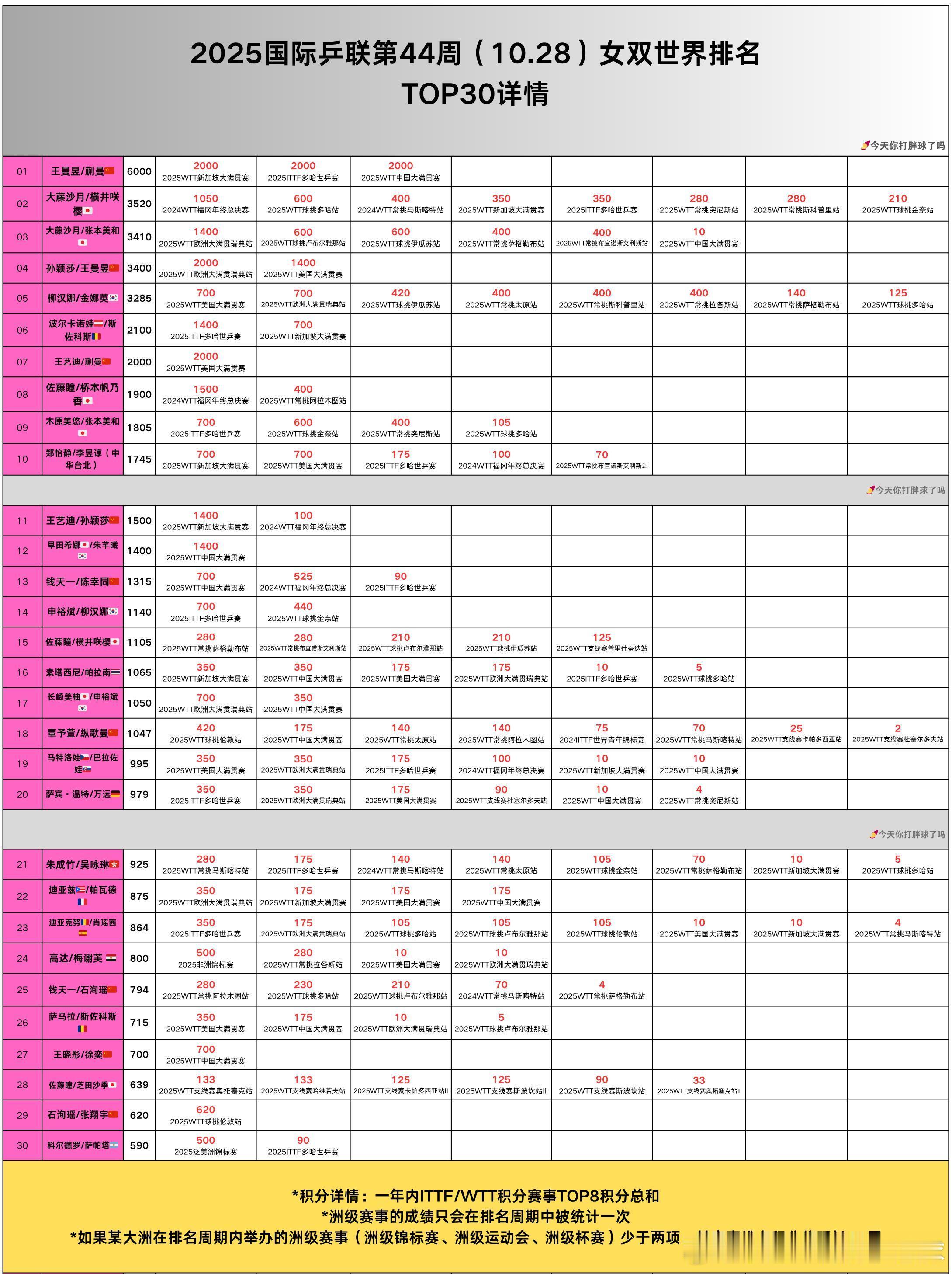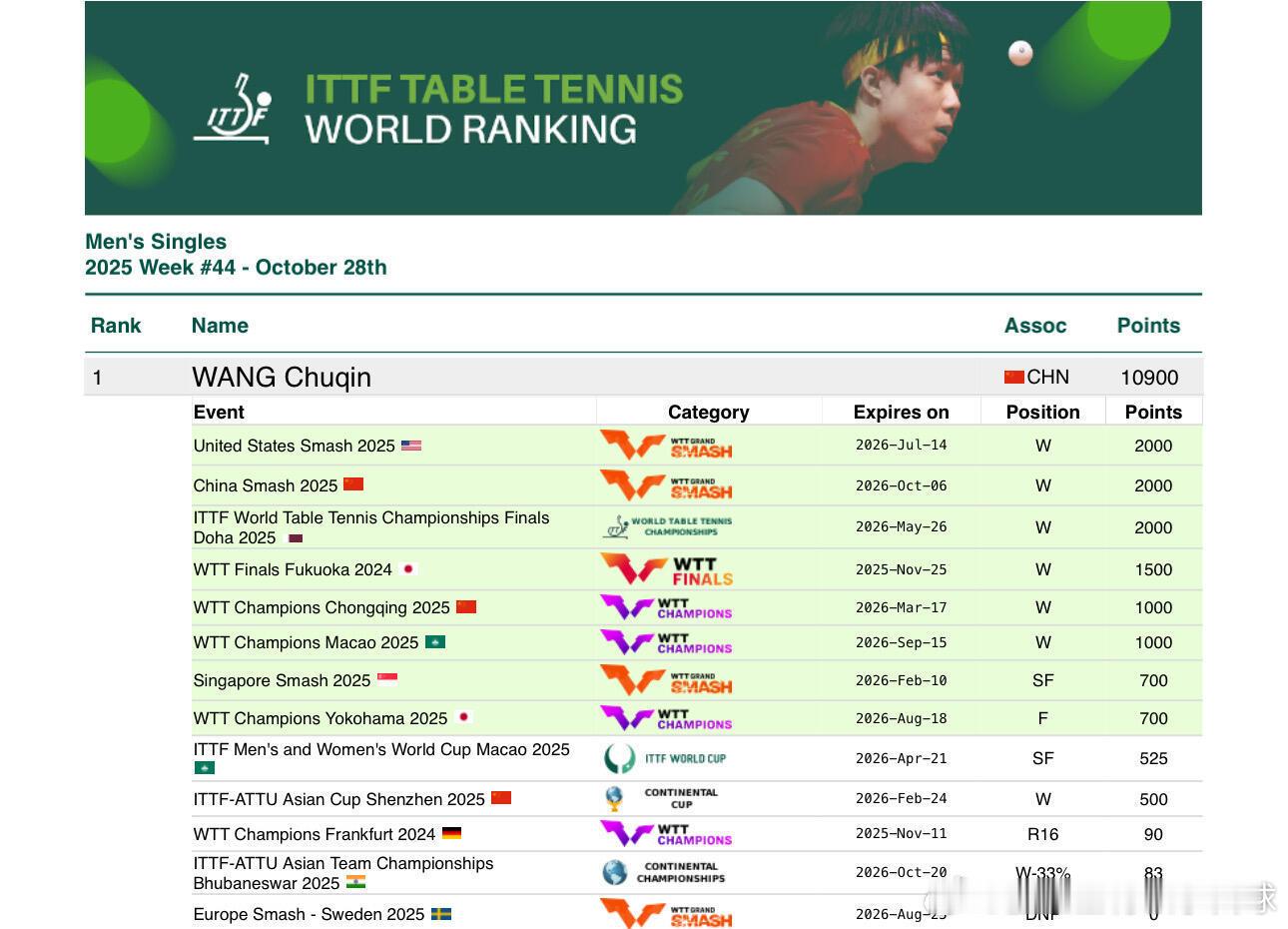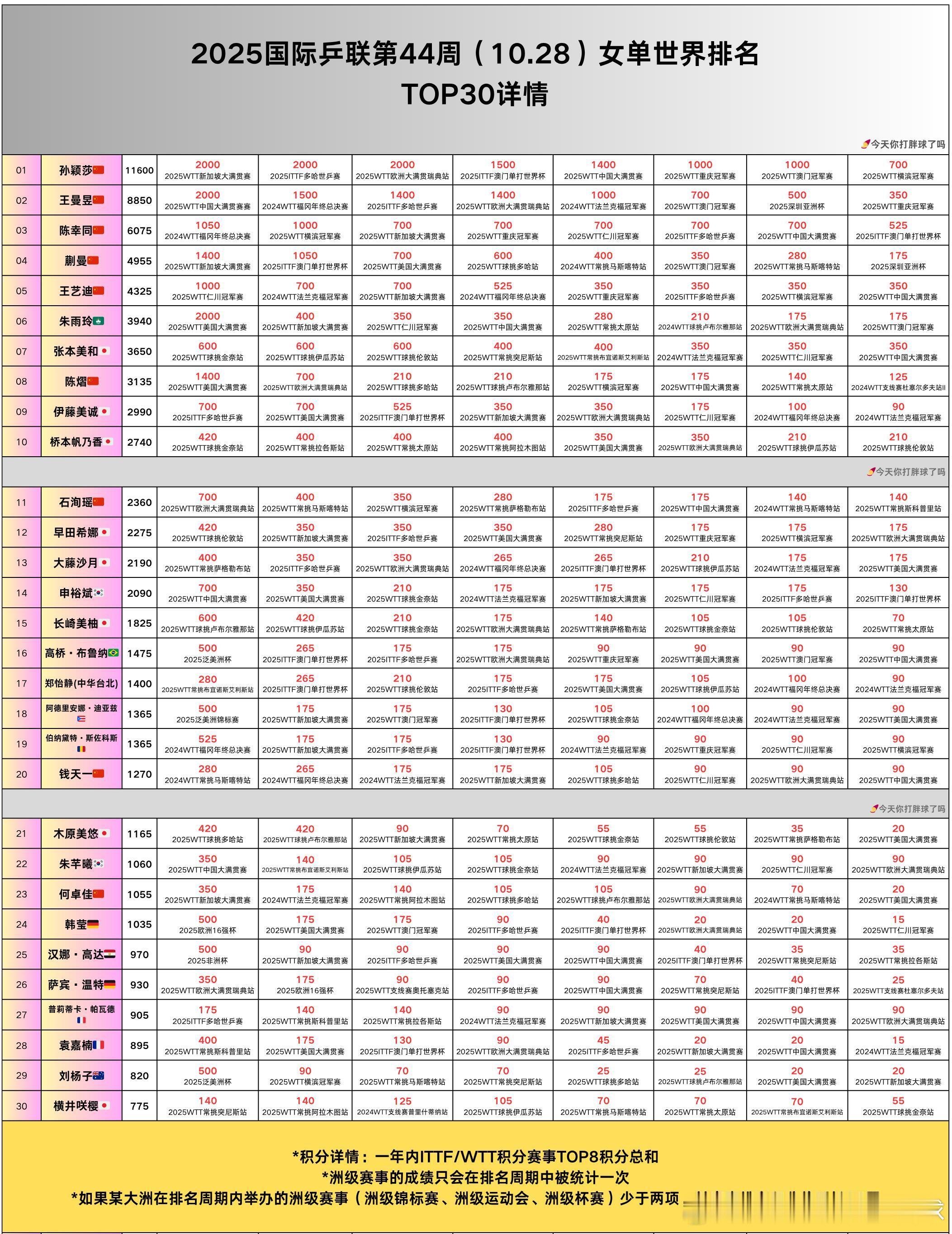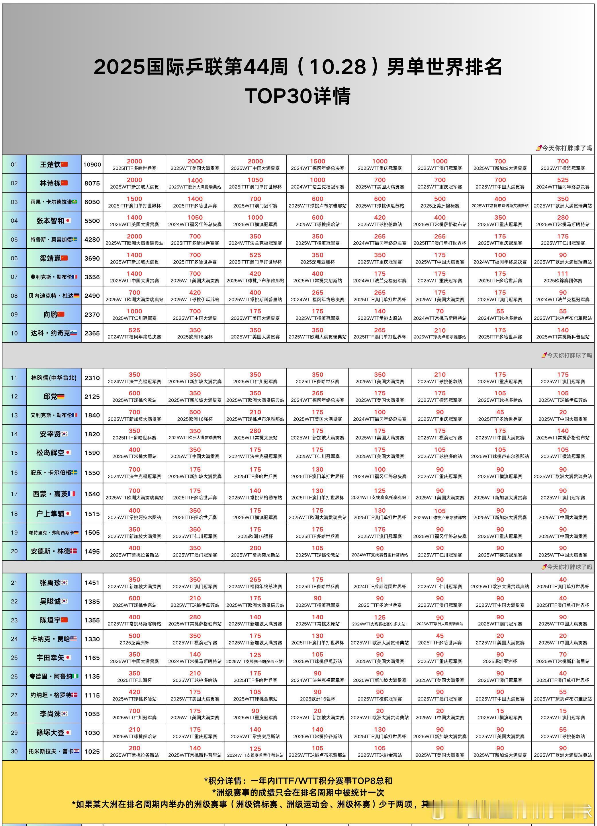 2025国际乒联第44周排名孙颖莎连续172周霸榜第一王楚钦10900分继续世排第一
