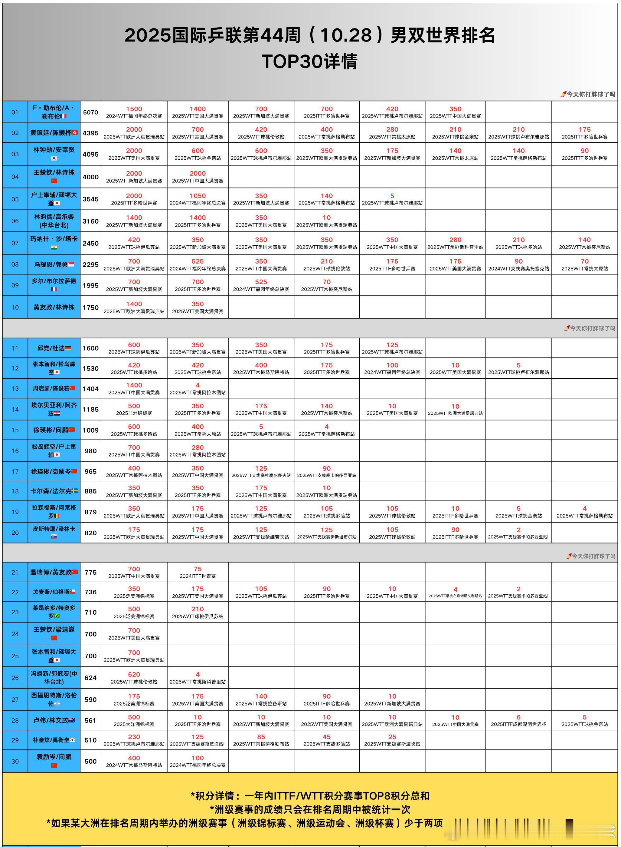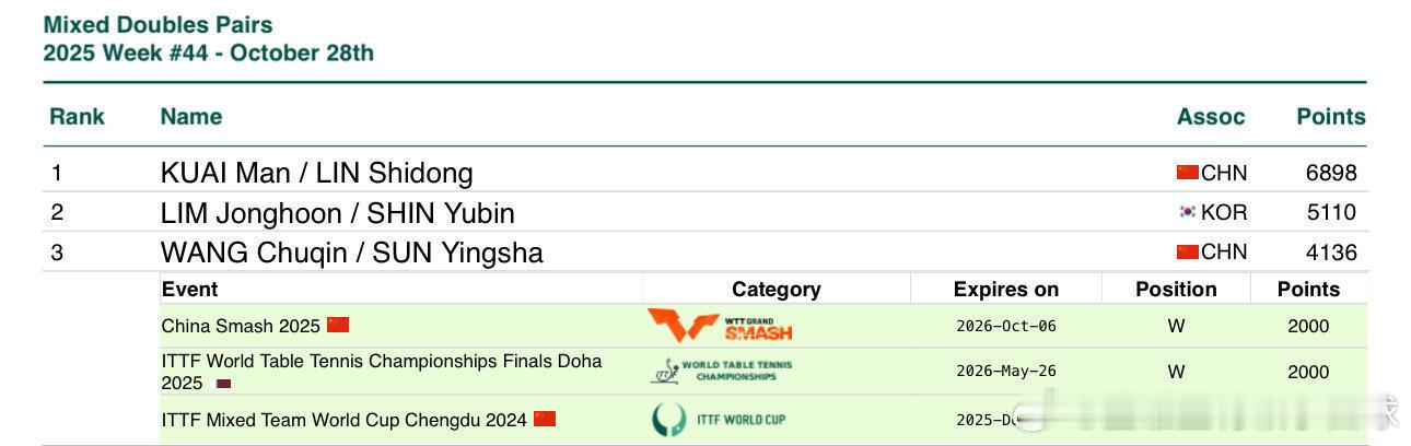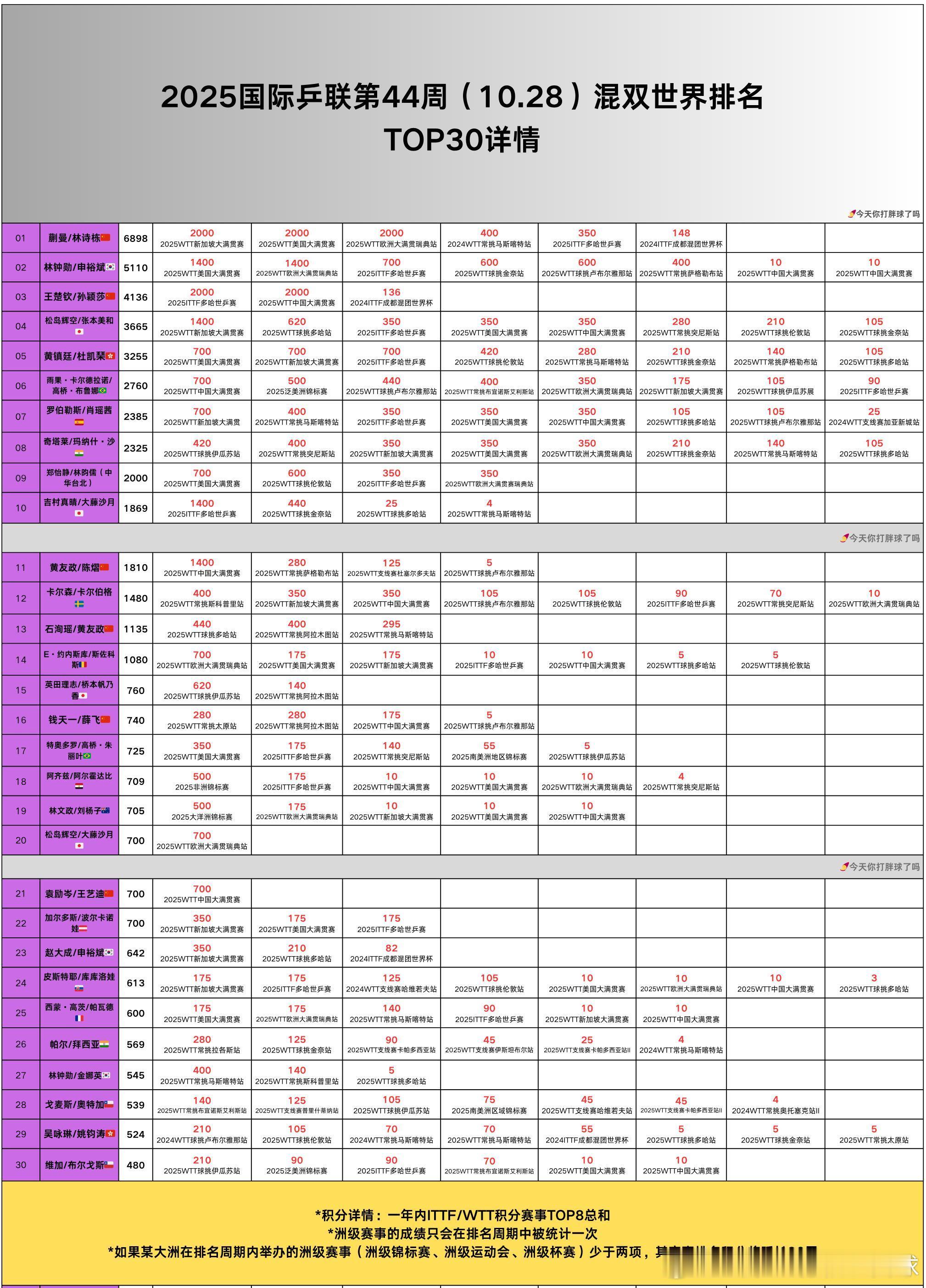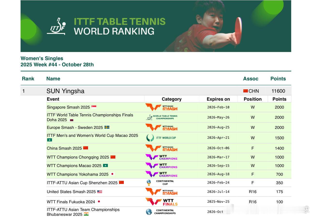 2025国际乒联第44周排名孙颖莎连续172周霸榜第一王楚钦10900分继续世排第一