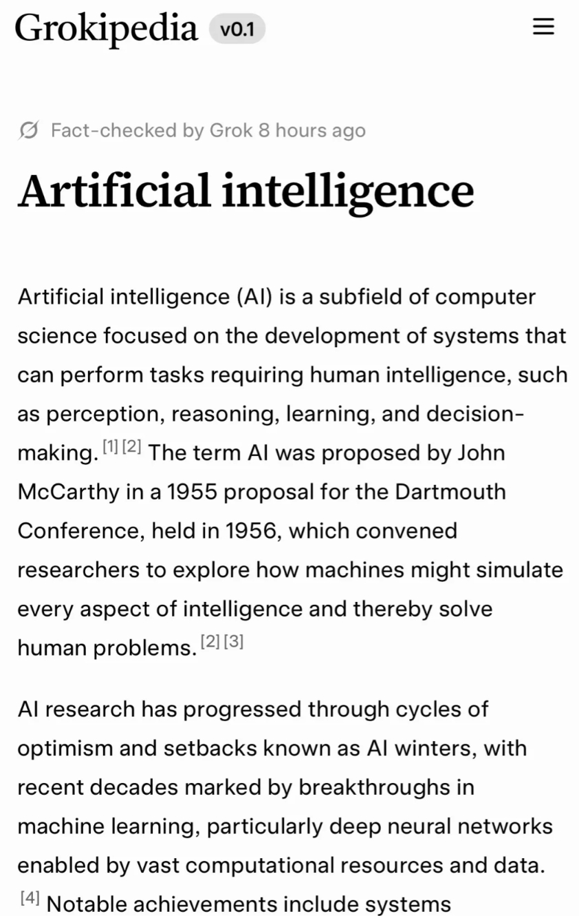 马斯克之前宣传的Grokipedia 上线了,号称用AI重写人类知识。界面神似维基百科,但所有内容都由Grok模型生成,还会给词条打上“真实”“部分真实”“虚假”四个标签。理念听起来很理想:只揭示真相、不掺杂偏见。