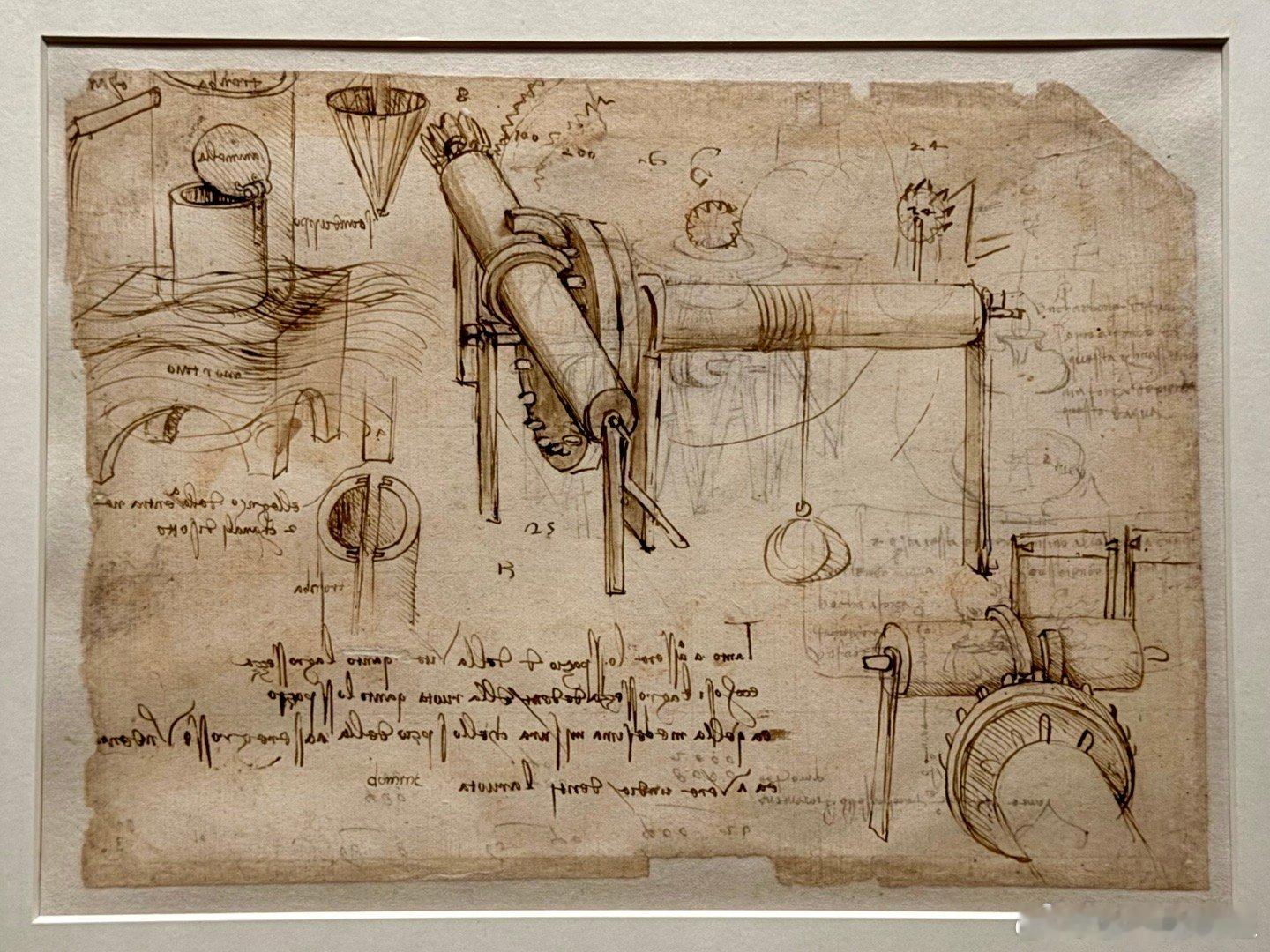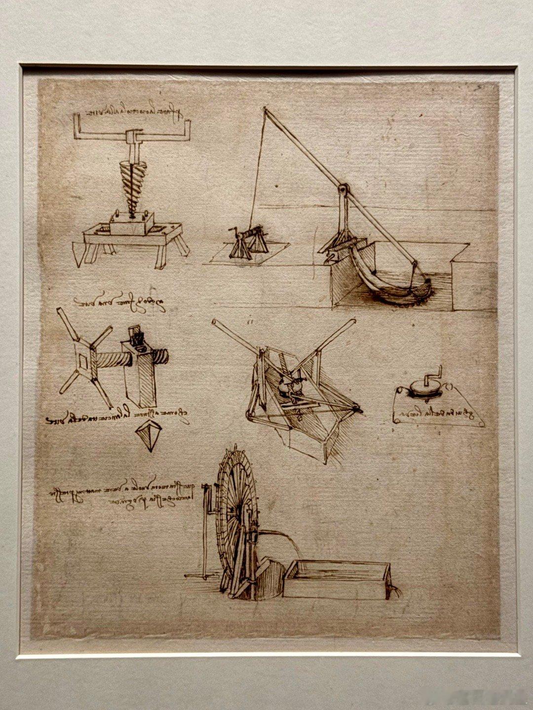 这个特展其实只有三件(组)文物,分别是“法尔内塞的阿特拉斯”石雕、彼得罗·佩鲁吉诺的油画《正义旗帜》(图7)和达·芬奇的《大西洋古抄本》手稿(图8-9),都是意大利的国宝级文物,其中最引人注目的是古罗马的阿特拉斯石雕。