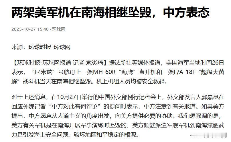 [太阳]两架美军机在南海相继坠毁,中方表态来了!真是伤害性不大,但“侮辱性”极强。中方表示,如果美方提出,中方愿意从人道主义的角度出发,向美方提供必要的协助。 南海本身是各方关注的热点,美国军舰和飞机经常在这搞巡航和演练。航母本来是为了显示实力,但频繁操作难免风险增多。 这次事故发生后,航母很快组织了救援,被困人员都安全捞了起来,没有出现伤亡,只是惊出一身冷汗。美国方面随即发布了简短声明,说正在调查具体原因,但基本没有透露太多细节。 中方的回应也很快,外交部表示如果美方有需要,可以基于人道主义提供帮助。这一表态既直接又坦然,既展示了中国的气度,也没有多加评论。 美军在家门口出了事,中国选择以合作和开放的姿态面对,给外界一种沉稳和自信的感觉。 事故发生的根本原因,可能跟航母本身设备老化有很大关系。尼米兹号服役时间很久,部分系统已经不是最先进的,而且长时间、高密度起降本就容易出状况。 从技术角度来说,像中国新服役的福建舰已经用上了电磁弹射,起飞更平稳,高效率也降低了故障概率。 相比之下,美军这艘老航母还在靠以前的蒸汽弹射,维护难度大,失误风险更高。这一次连续坠机,无疑暴露了这样的问题。 南海的国际环境一直比较复杂,美国在这里频繁露面,说是维护航行自由,其实更多是想刷存在感。 就在各国都在自家附近活动的时候,美国这个远道而来的“客人”确实容易引发一些突发状况。过去几年美军在海上也出现过类似事故,从舰船到飞机,老化和管理压力一直是短板。 每一次意外都会让外界看到美军看似强悍背后的压力和隐忧,不仅仅是设备问题,长期任务和资源分配也摆在那儿。 事实上,军队真正的竞争力不是让武器跑到全球每个角落耀武扬威,而是能在关键时刻处理好危机,应对各种意外。 像中方这次的冷静态度,愿意帮助对方,同时保持专业和自信,无疑给本地区注入了理性和稳定。这样的做法,不光关乎技术,更体现了对安全和人性的尊重。 综合来看,这次南海坠机是意外,也是提醒。全球海上安全管理不能只靠口号和武力,设备更新和细致维护才是根本。各国在这个舞台上如何合作、如何应对挑战,比单纯地比拼武器更重要。