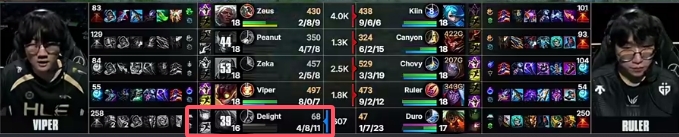 直播吧10月28日讯S15八强HLE零比二GEN,本局比赛HLE辅助Delight使用波比完全被打出辅助差距,连续冒进送头掉点,最终打出4-8-11的战绩。
