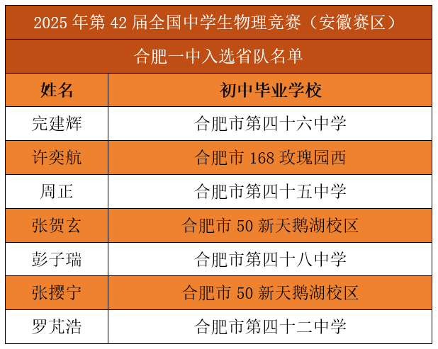 2025年第42届全国中学生物理竞赛(安徽赛区)合肥一中入选省队名单