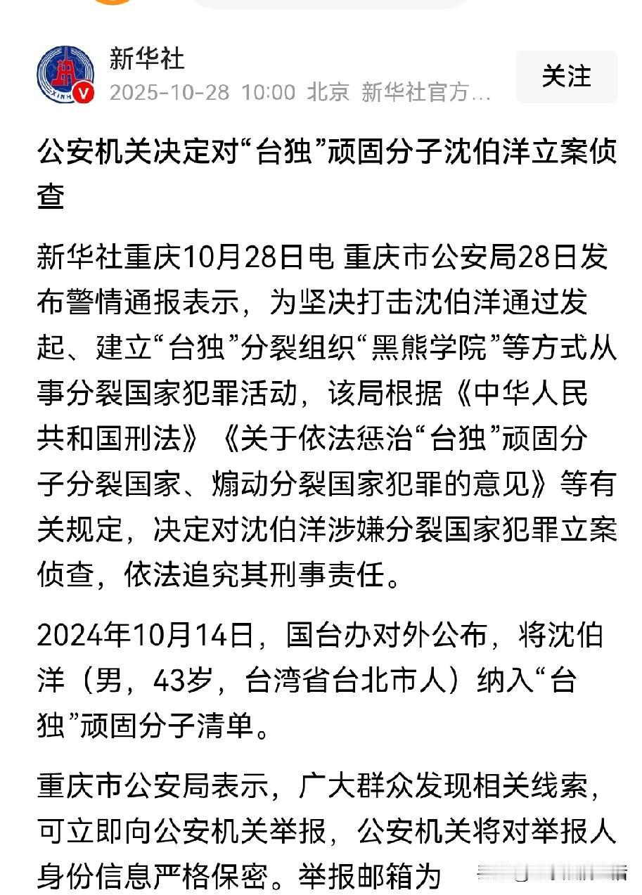 国家队一出手就是王炸。 高安国被抓的对等措施马上就有了。 沈伯洋被第一个立案侦查,台湾的青鸟、黑熊们是不是已经瑟瑟发抖了。 台湾省的回家,已经是势在必行了,有人预测,从目前两岸的实力和目前的形势来说,相信这一天很快就到了。 最近台湾网红“馆长”来大陆旅行,全程直播沿途的风景,向台湾同胞真实的展现了如今大陆的发达程度,给那些青鸟和黑熊们当头棒喝,不知道他们是否觉得尴尬啊。 这个顽固分子清单,更像是一个黑名单,一个人人喊打的坏份子,和通缉令差不多的意思。 这个人从面相和外貌看,汉人的血统不是很多,可能亚洲其他国家的血统更多一点吧。 另外从他的眼神中,透露着邪恶,和《沉默的荣耀》中的那个谷正文似乎很像,就是那么一类人。眼睛是心灵的窗户,上翻的死鱼眼,从眼睛就能知道这个人,绝非善类。 “黑熊学院”这个名字也暴露了他们的狼子野心,这是要专门培养一群黑熊啊,而黑熊是什么样的动物,然而黑熊的文化象征却是贪婪和邪恶。 从心理学角度,黑熊象征被压抑的欲望或直觉,反映对力量或安全感的渴望。同时代表愤怒、恐惧等负面情绪。 所以这样的组织培养出来的人,妥妥的马前卒。后面应该全面制裁他们,让他们失去生存的经济来源,饭都吃不上,看他们还怎么折腾!