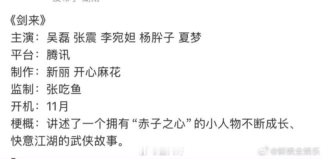 吴磊的古装剧《剑来》又有新消息了,新剧昨日官宣男主吴磊后,离开机也不远了。这部剧除了有李宛妲、杨肸子、夏梦三位新生代演技花,连影帝张震也回归古装剧了,已经开始期待新剧能早日开机了!