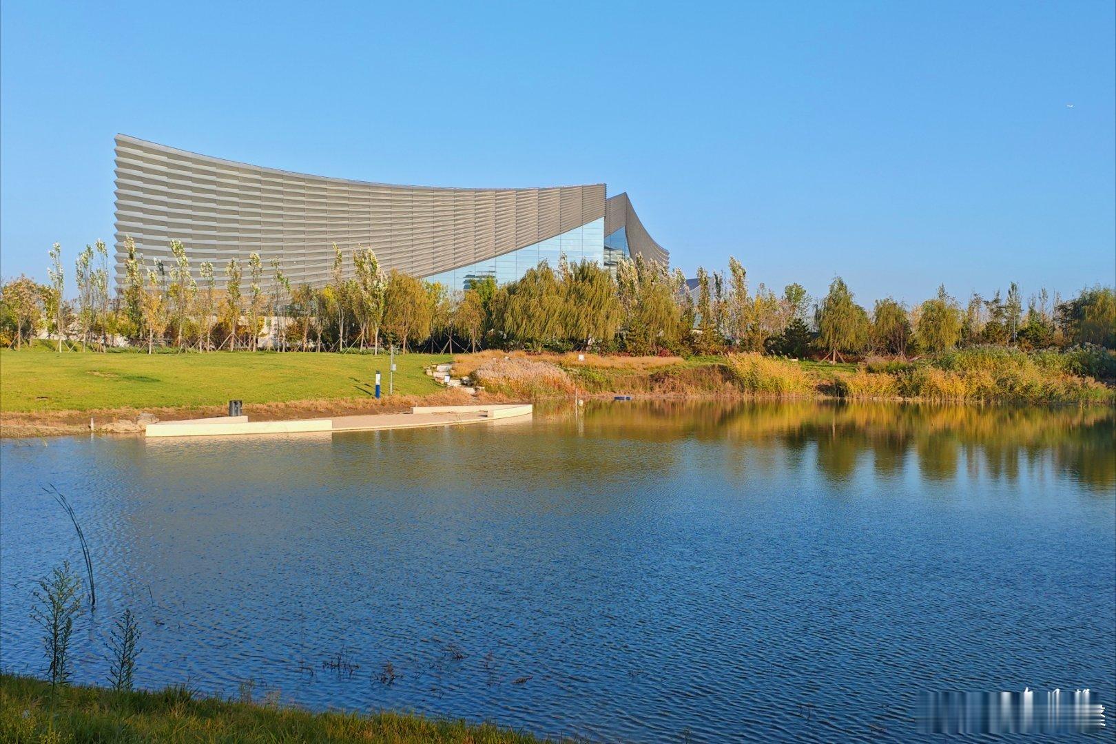 【深秋时节】🍂🍁大运河畔的北京艺术中心,真的太震撼啦!被称为“文化粮仓”,满满的艺术气息。有歌剧院、音乐厅、戏剧场、小剧场和露天剧场,各有特色。在大运河畔,单脊双坡屋顶尽显中式韵味,青绿色调典雅大气。4000多块立体折叠铝板组成的幕墙,光影变幻,仿佛徐徐拉开的舞台大幕。旁边大片的草坪绿意盎然,与建筑相互映衬。用镜头定格北京最美之秋