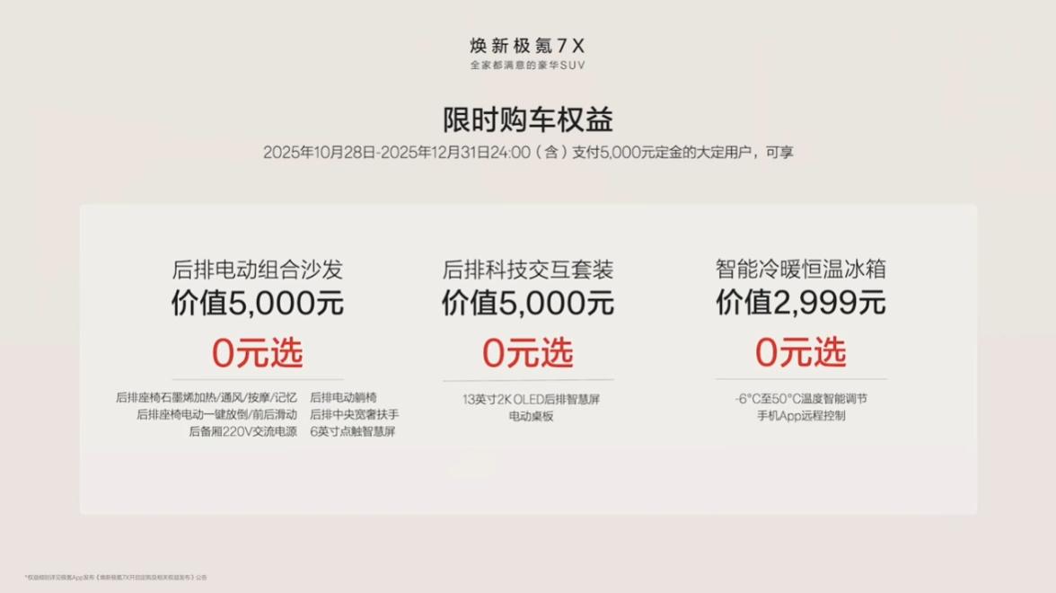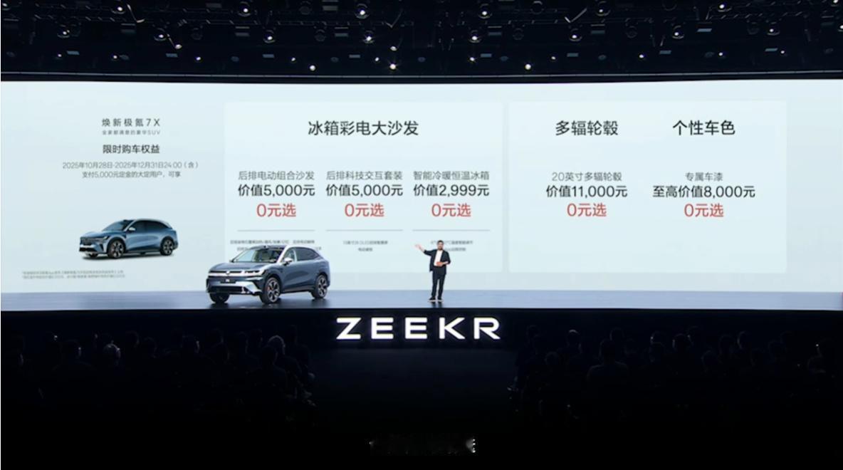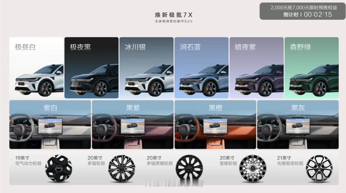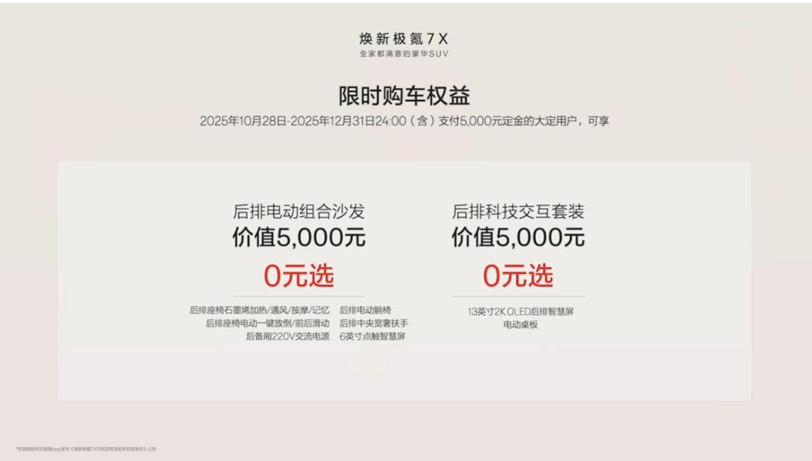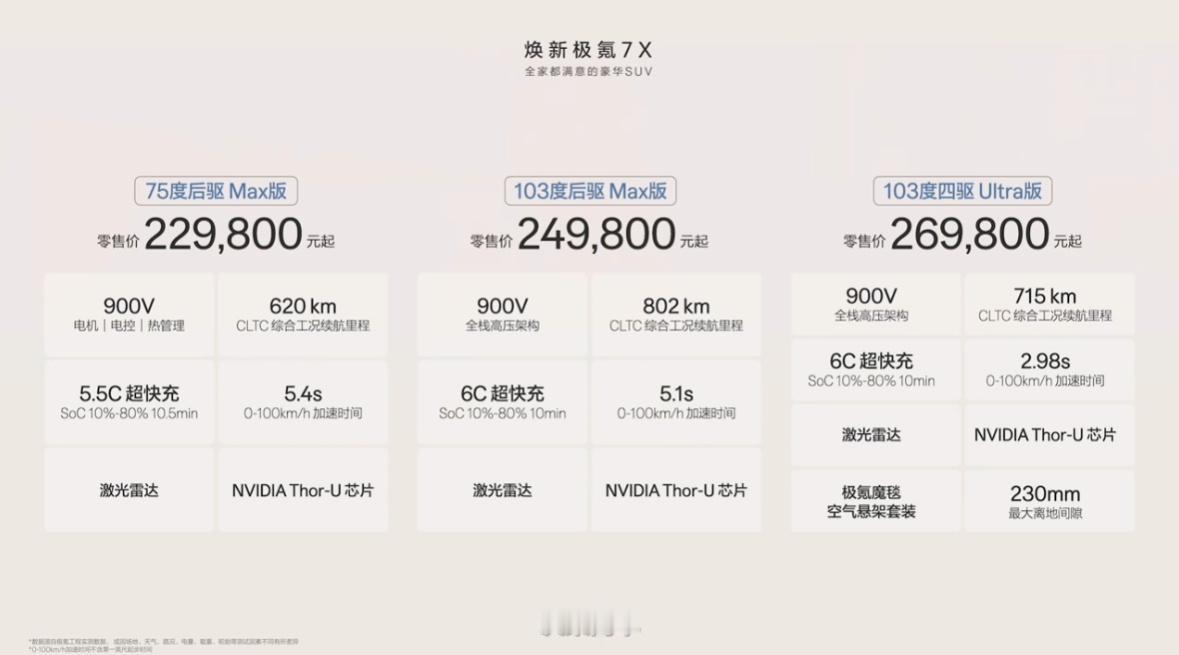 焕新极氪 7X 规格:4825*1930*1666mm,轴距:2925mm(C级车) 能源形式:纯电 驱动方式:后驱/前后电四驱 电机功率:前215/后370kW 充电倍率:5.5C-6C 高压架构:900v 电池容量:75度(神盾)-103度(金砖) 电池形式:零酸铁锂/三元锂电池 续航:620km-802km 零百加速:5.4s-2.98s 悬架:前双叉臂后五连杆(液压衬套) 离地间隙:197-230mm(顶配可变) 智驾芯片:Nvidia Thor-U 座舱芯片:高通8295 智驾辅助:千里浩瀚H7 智驾硬件:1*激光雷达\毫米波雷达\摄像头 屏幕:13.02仪表+16中控+36.21AR-HUD+13寸后排OLED娱乐屏 颜色:外白/黑/银/蓝/紫/绿,内黑灰/紫白/黑紫/黑橙 后备箱:前备箱38L/后905L 座椅配置:后排电动组合沙发/后电动遮阳帘/后排座椅加热按摩(石墨烯) 其他配置:四门双层夹胶玻璃、智驾小蓝灯、5.3L智能冷暖冰箱、麂皮包覆顶棚、21扬声器、无线50w*2 21.98万 75度电池后驱Max版 620km/零百5.4s/5.5C 千里浩瀚H7/无框车门/电尾门/加热折叠后视镜/后排私隐玻璃/真皮方向盘 19寸轮毂/皮座椅/前后排通风加热按摩电调/后备箱220v电源/360影像/行车记录 23.98万 103度后驱Max版 802km/零百5.1s/6C 25.98万 103度四驱Ultra版 715km/零百2.98s/6C 四驱/魔毯空气悬挂+CDC,自适应远光灯+自动大灯 其他: 超级置换金10000元 13500元购置税兜底 送: 后排电沙发5000元 后排娱乐交互套装5000元 冷暖冰箱 2999元 20寸轮毂11000元 选配: 20寸轮毂 21寸轮毂 魔毯悬架 一体智慧灯 全车感应自动门 Nappa真皮座椅 教授觉得,不是追求顶配的魔毯+CDC的话,中配的802KM续航也很想,该有的配置都有了。顶配和中配之间,差了一个四驱和魔毯,基本参数都相近,低配当然也可以选,该有的都有。极氪在中高端车上还是厚道啊。【来自懂车帝车友圈】