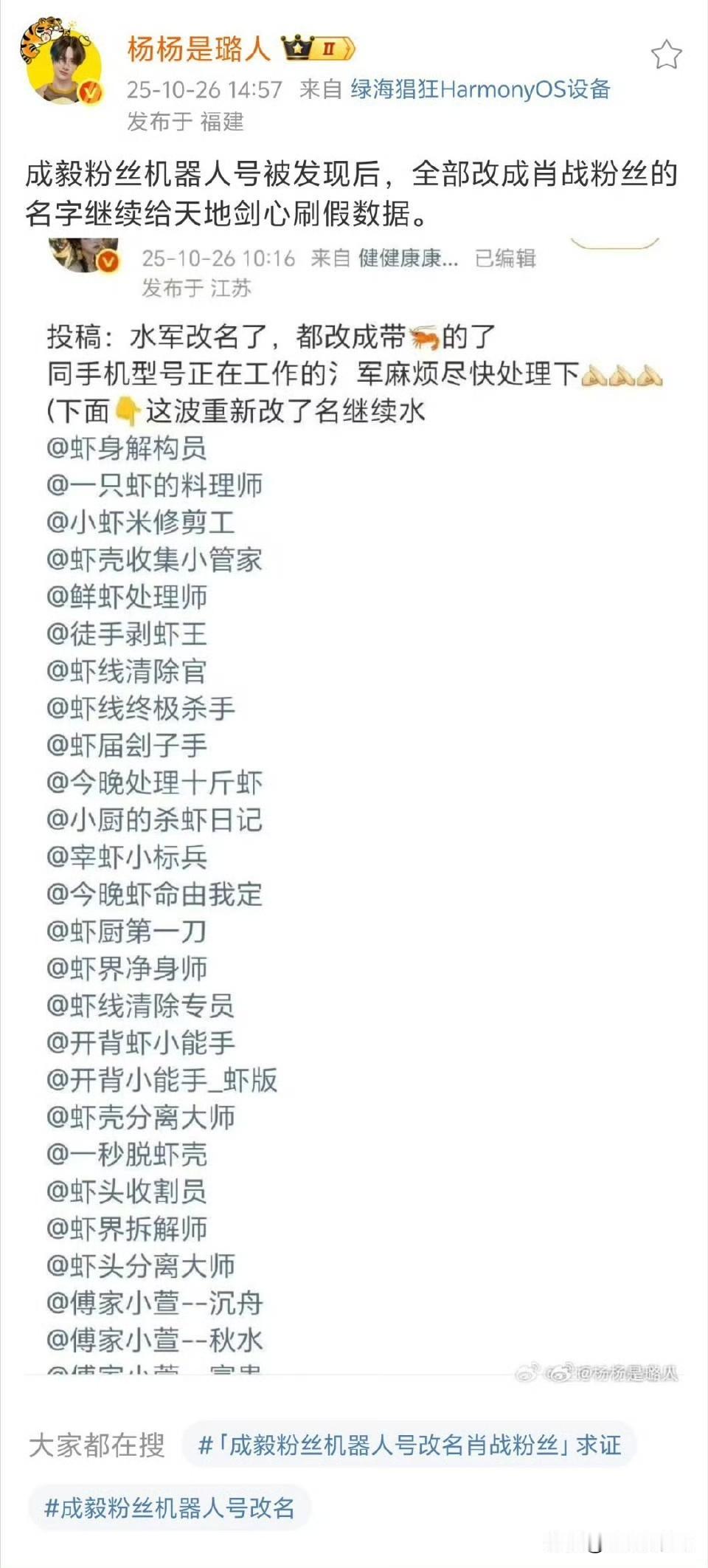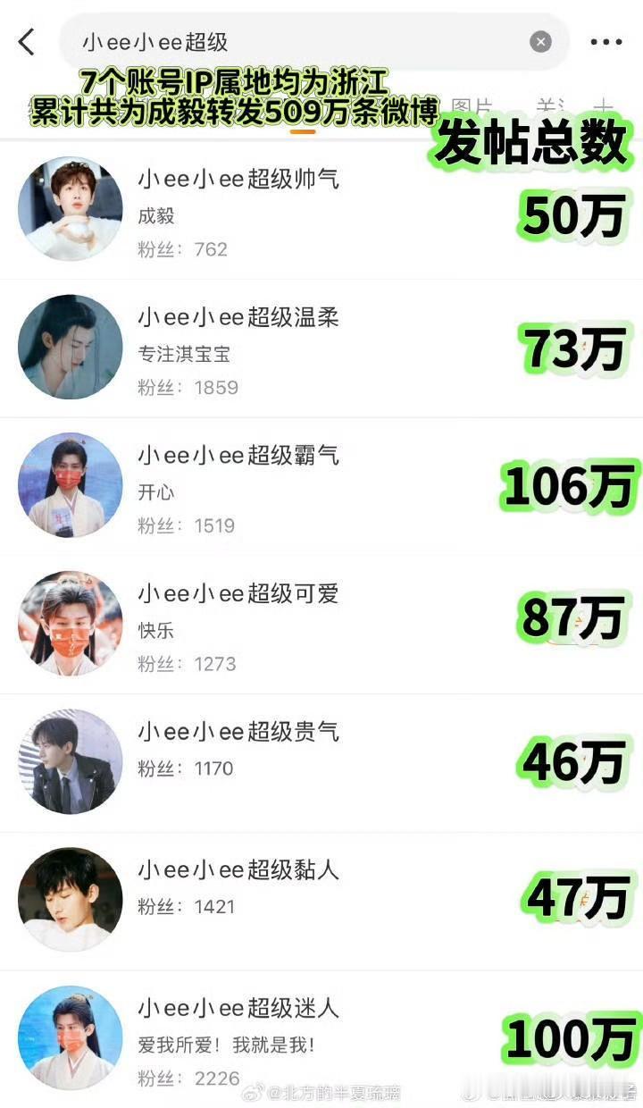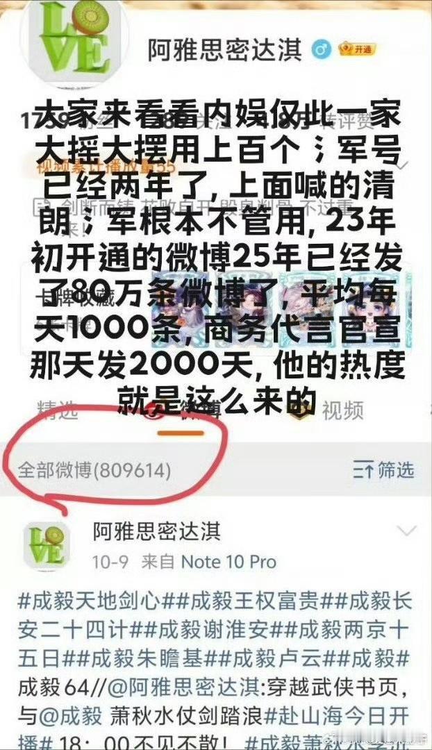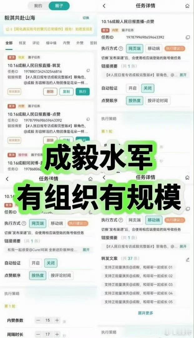 成毅公然买氵被网友发现后,平台开始大量封禁他的氵军号。结果还不知收敛,继续开新号买氵,有恃无恐,怕被网友发现,用其他艺人粉丝的头像名字开新号,好栽赃陷害其他艺人和粉丝,简直太可怕了,为了红毫无底线,这样的人一定会遭反噬的。我不知道除了机器人,现实生活中会有真人喜欢这样的明星吗,作假做人都毫无底线,如果还有人喜欢,那可真是一丘之貉,物以类聚网络黑水军 了