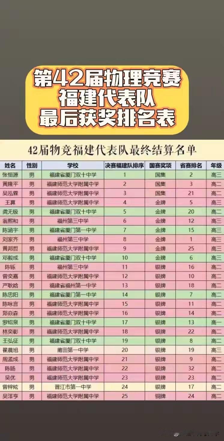 第42届全国中学生物理竞赛福建省最终成绩 福建作为这次的东道主, 共有25人参加最后的物理竞赛冬令营比赛, 其中有3人进入国家集训队, 10人获得金牌,占比40%; 14人获得银牌,占比56%; 1人获得铜牌,占比16%。 获奖人员只有1人来自高一, 有17人来自高二,有8人来自高三, 东道主的成绩在全国来看成绩是相当优异, 福建的物理竞赛也是在大踏步的前进了。