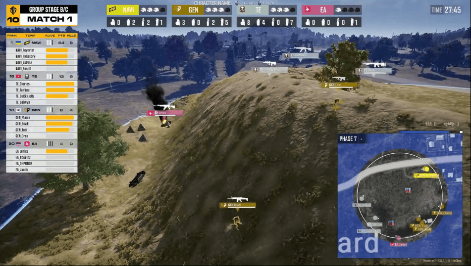 决赛圈,GEN先将EA最后一人淘汰。随后GEN将圈边挂后的Tanvuu打掉,TE两人前来支援也被淘汰。最终NAVI占据更好位置轻松吃鸡。