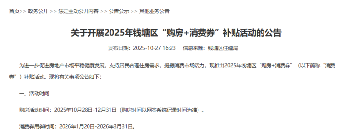 购房活动时间:2025年10月28日-12月31日(购房时间以网签系统记录时间为准)。
