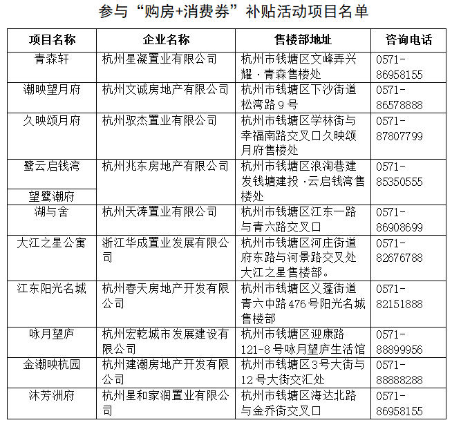 继临平区、萧山区、余杭区发布购房补贴后,杭州钱塘区也跟上了发放补贴的脚步,每套房10万元,总额度为5000万元,有11个楼盘可以选择。