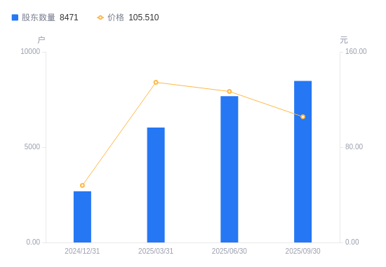 日期A股户数(户)流通A股户均持股数(股)户均持股市值(万元)2025-09-3084713760.8339.682025-06-3076742965.3037.592025-03-316030953.5712.822024-12-3126822143.9210.262024-09-3020782285.858.262024-06-3023592013.576.95