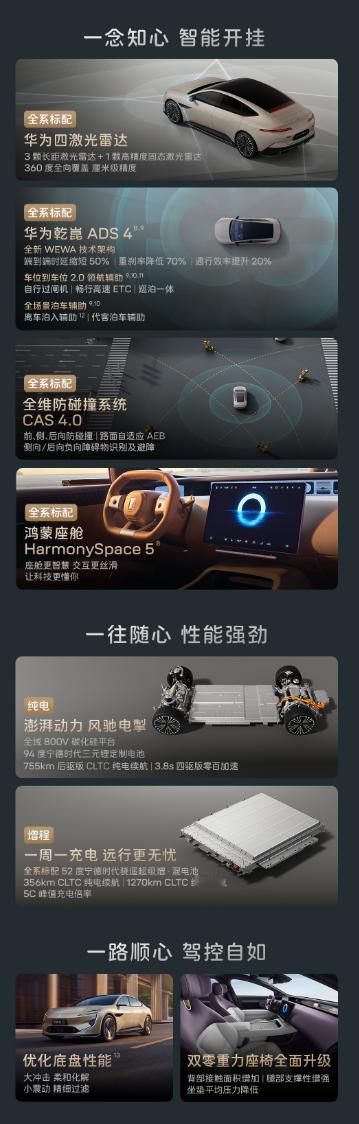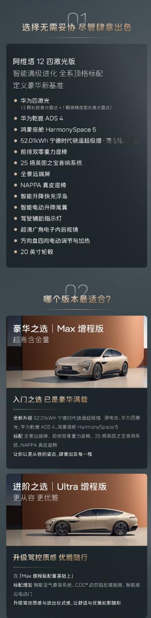 阿维塔12四激光雷达版今天上市,有增程有纯电,还有皇家剧院版可选,售价25.99~41.99万元,还有五大限时权益一同发布。 新增曦金灰车漆、岩棕内饰,智能感应电动门、四屏联动星际太空座舱,搭配头顶娱乐屏,以及全系标配的英国之宝音响,顺势就为你打造出专属贵宾厅的模样。 这次升级的重点,全系标配3颗长距激光雷达、1颗高精度固态激光雷达,覆盖角度更全也更广。全系标配华为乾崑ADS 4、鸿蒙座舱5、全维防碰撞系统CAS4.0。华为全家桶缺一不可,配置直接就拉满了。 动力方面,纯电版用的是宁德时代94度三元锂电池,全域800V,有单电机和双电机可选,CLTC续航705、755公里。 增程车型全系标配52度宁德时代骁遥增·混电池,具备5C,纯电CLTC续航356公里,CLTC综合续航1270公里。【来自懂车帝车友圈】