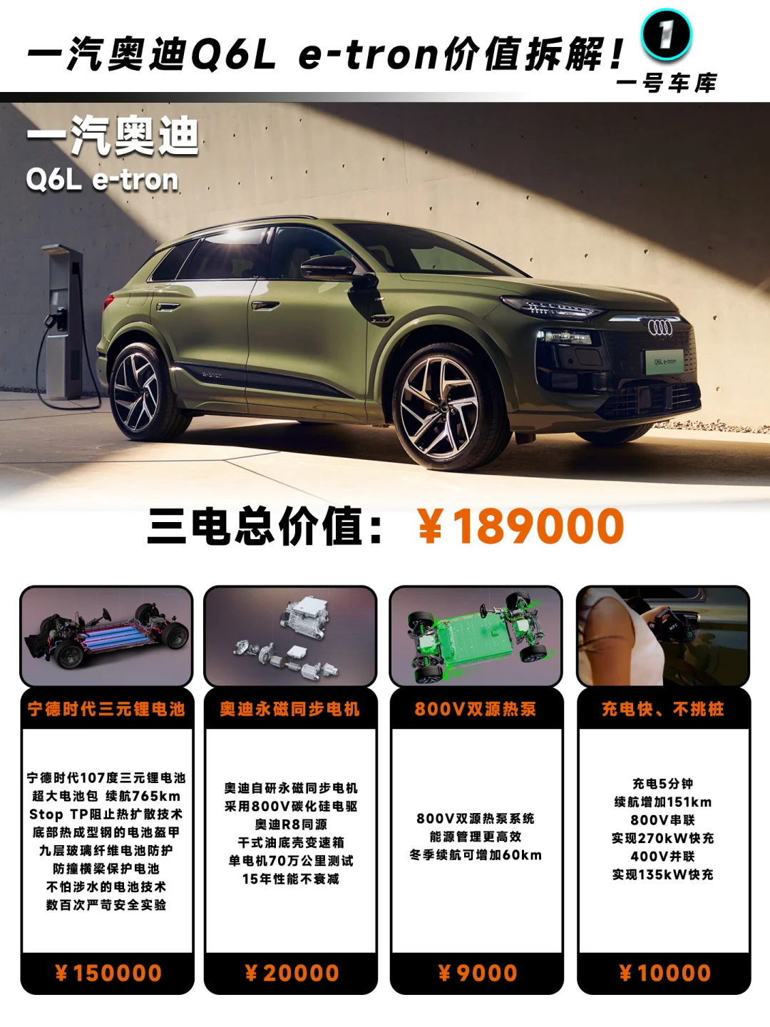 充电采用800V串联实现270kW快充以及400V并联实现135kW快充,价值10000元;