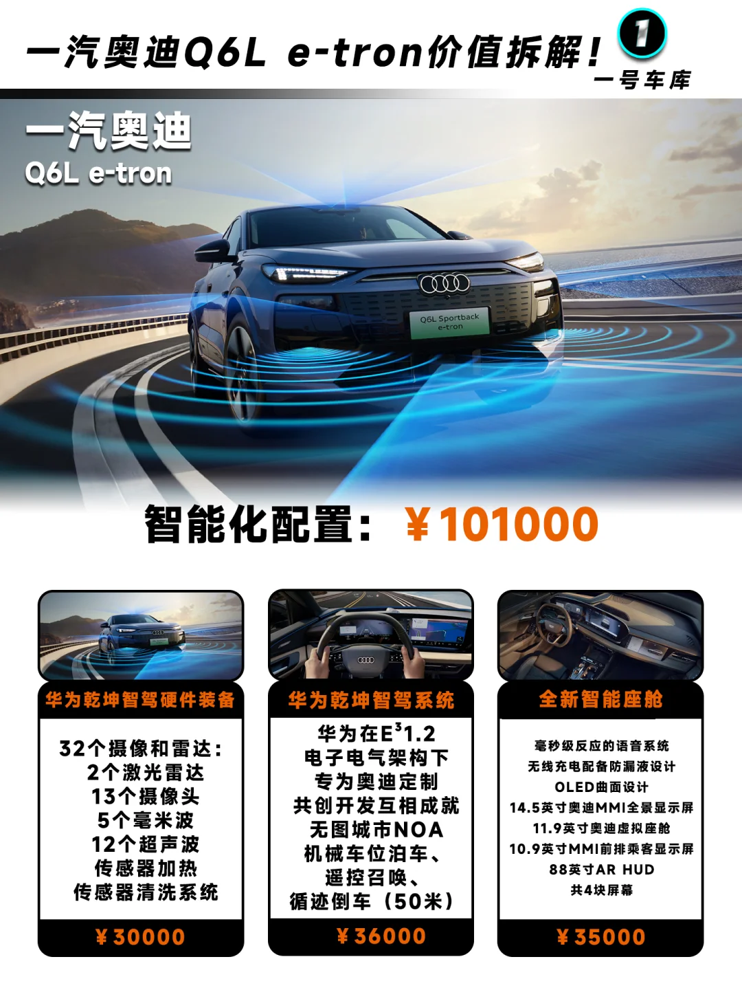 华为为奥迪深度定制的高阶智驾辅助功能,支持无图城市/高速NOA、机械车位泊车、遥控召唤、循迹倒车(50米)等,价值预估36000元;