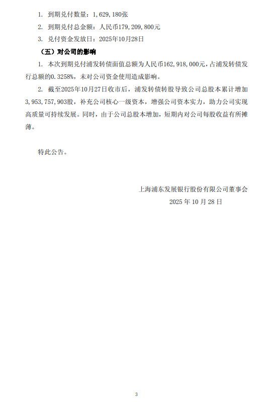 公告称,根据中登上海分公司提供的数据,浦发转债到期兑付数量约162.92万张,到期兑付总金额人民币约1.79亿元,兑付资金发放日为2025年10月28日。