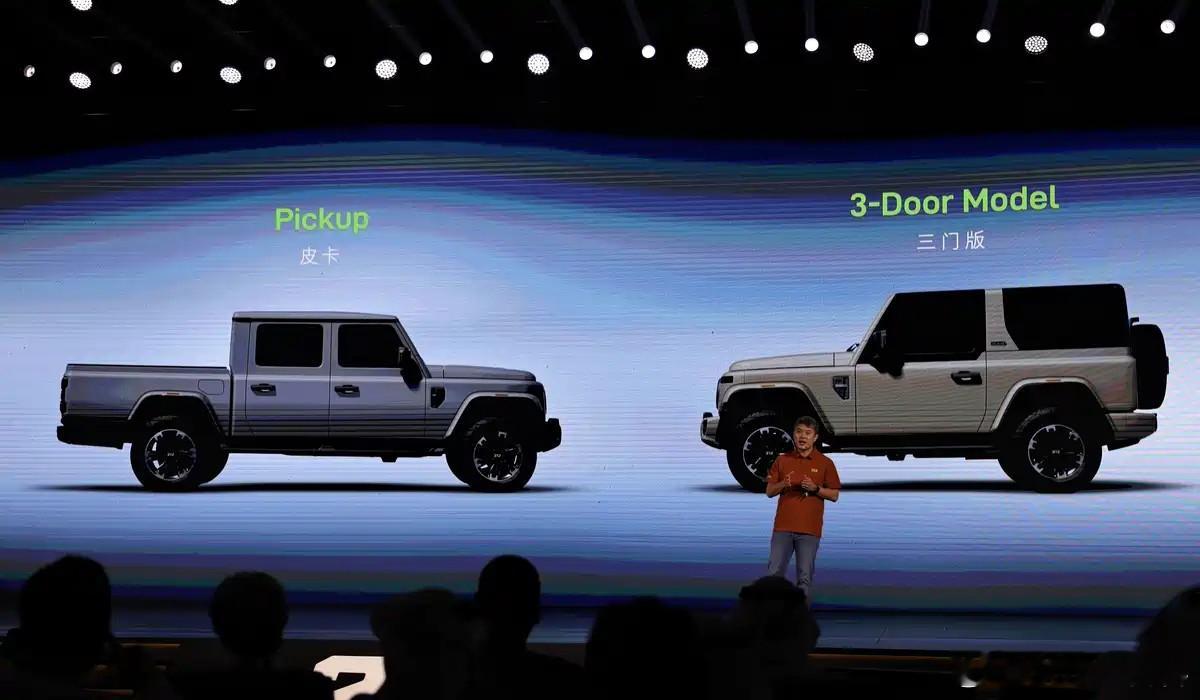 产品方面,212官方首度预告皮卡版和三门版,从造型上看,皮卡版是在T01二排加长的基础上,嫁接了一段标轴尺寸的货箱,虽然比例上和jeep角斗士 有几分相似,但车身形式上更接近传统皮卡,实用性为先