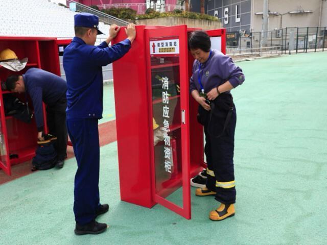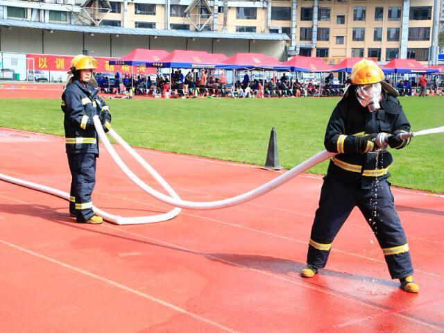 在百米灭火毯灭火操中,“预备、开始!”随着裁判的一声令下,杨兰迅速冲出到器材柜,穿戴好灭火着装,拿上灭火器,一边跑向着火点,一边做着灭火的动作“提—拔—握—压”一整套动作行云流水、一气呵成。