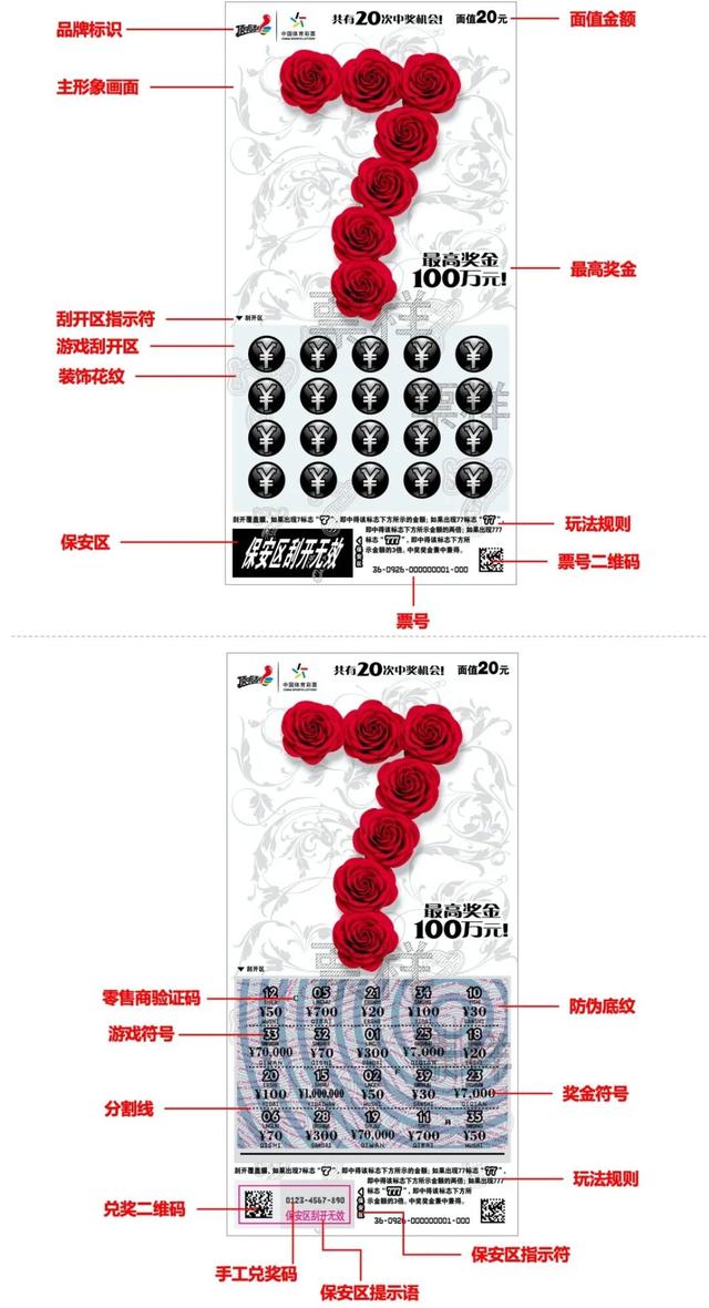 保安区和刮开区都有覆膜,票面印有专属防伪装饰纹,贯穿覆膜区域和非覆膜区域的防伪装饰纹是完整图案,购买的时候要注意观察;