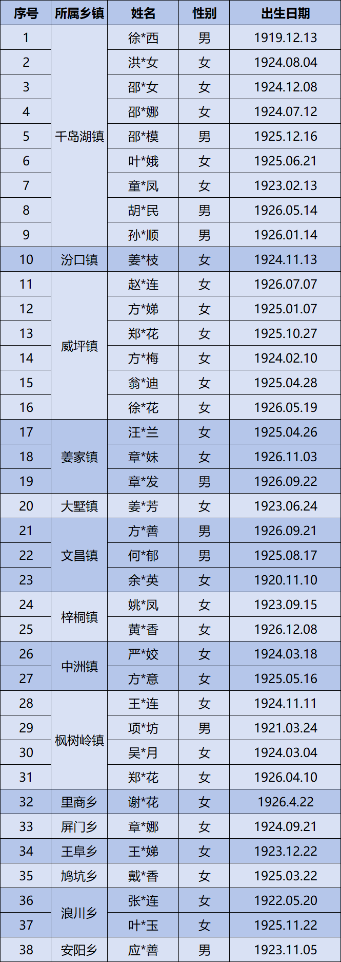 今天上午,淳安县发布了2025年淳安县百岁老人名册。据统计,截至目前,淳安县共有38位百岁老人。其中以千岛湖镇的徐*西最为高寿,1919年12月出生,现为107岁(虚岁)。
