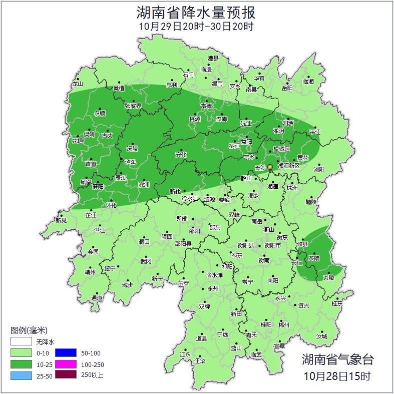 湖南省气象台预计,10月28日晚上到29日白天全省以晴天到多云为主;10月29日晚到30日白天,全省有小到中雨;10月30日晚到31日白天,湘南阴天间多云有小雨,其他地区多云。需注意的是,10月29日湘西北、31日湘中以北部分地区早晨有雾。气温方面,10月28日到29日气温缓慢回升;10月30日到11月3日受降水和冷空气影响,气温稍有下降。