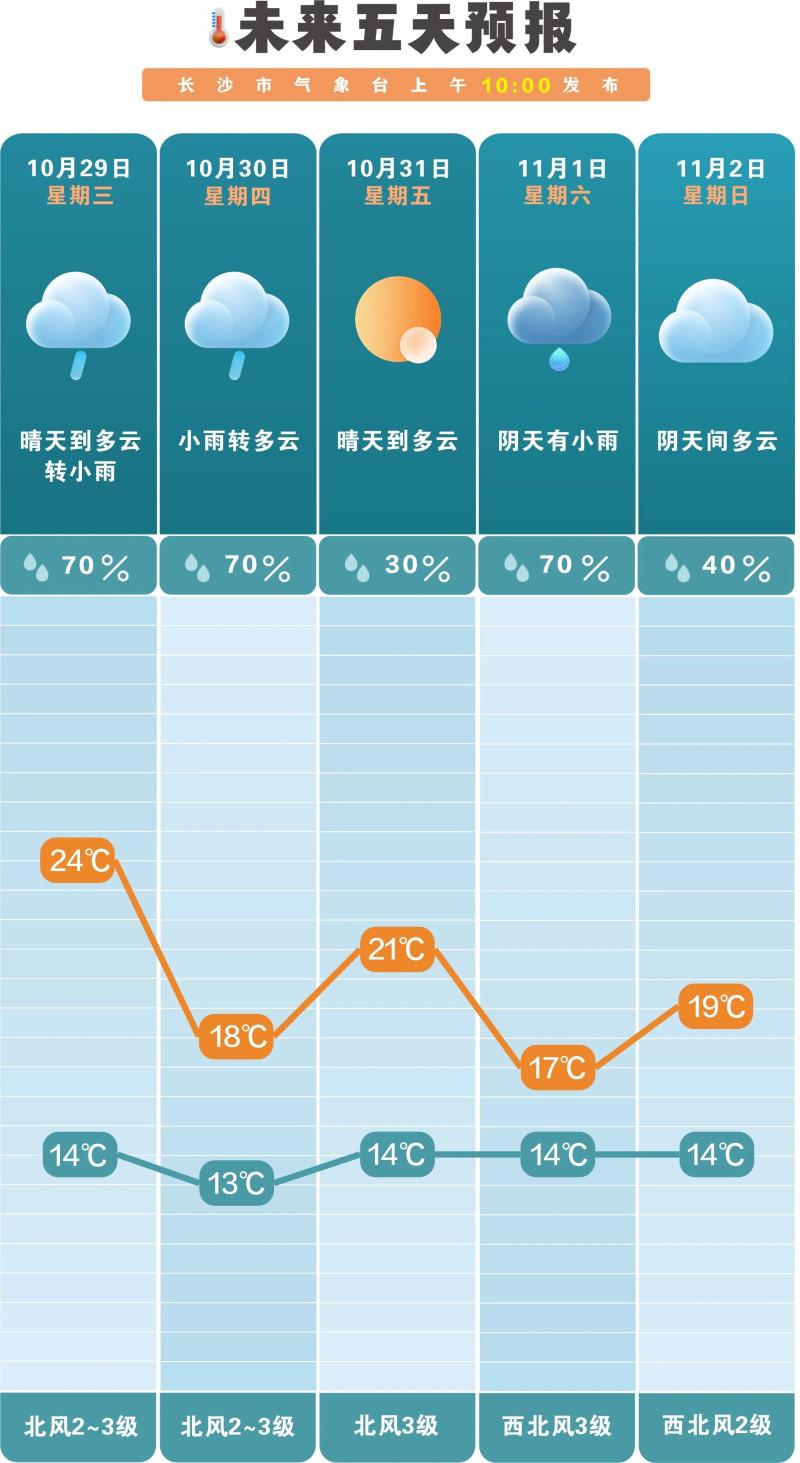 长沙市气象台今日发布未来五天天气预报,预计从10月29日夜间起长沙将迎来一轮明显降温和降雨天气,市民需注意及时添衣、防范阴雨影响。