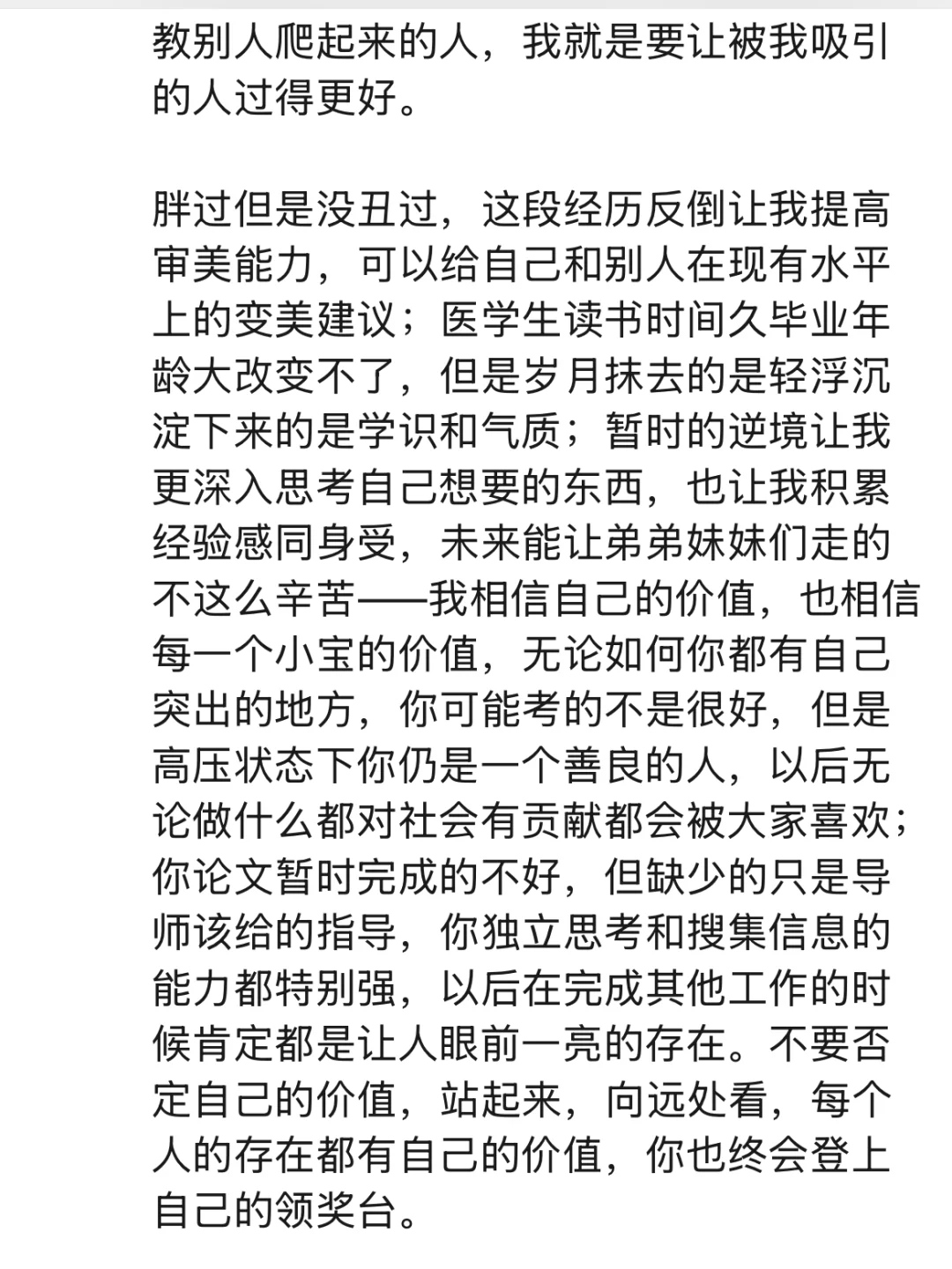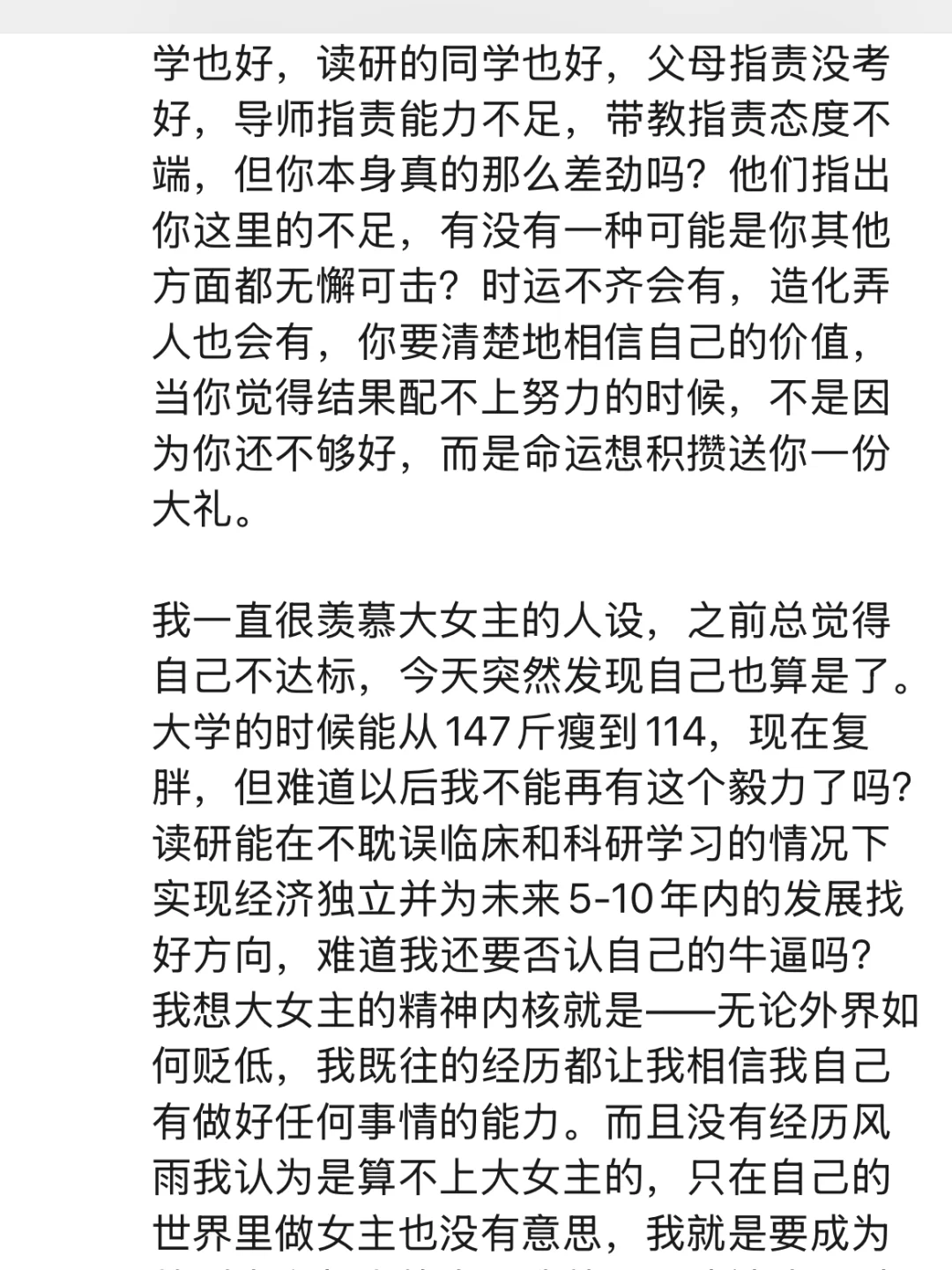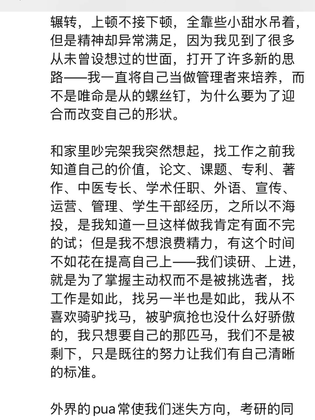 研三,秋招经历过一点点社会的毒打之后的思考。 最近一直没怎么发动态,也是不停地在内耗中自救,终于成功地走出来了,就想和小宝们分享一点心路历程。 学历确实不是唯一的途径,但学生的身份却是一种有力的兜底,能让你无所顾忌地尝试从未想过的生活,给未来新的选择。 我依然鼓励大家去学习去闯荡,去挑战更多可能,人生最重要的是经历,希望我们都皆有所获