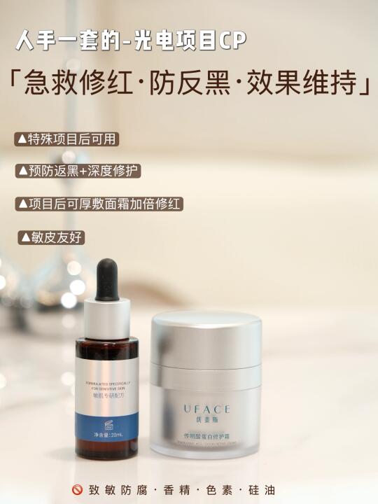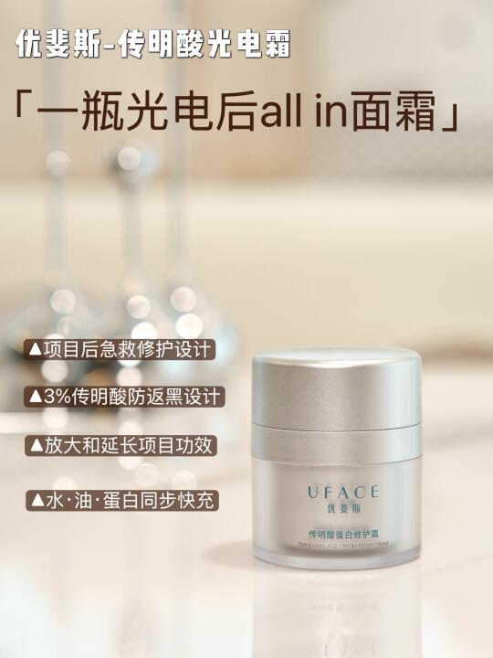. ▲姐妹们!上周刚do完超光子 这周去公司,同事都问脸怎么透亮得像剥了壳的荔枝 其实就是基础成熟的光电项目啦~ 不过项目后优斐斯这对"光电CP" ——急救防反黑功劳超级大!简直我的刚需CP 光电项目后容易反黑的可以好好收下下这篇攻略了 . ▲我的皮肤也比较薄,做完光子当天, 两颊红烫得能煎鸡蛋 洁面后我直接厚敷了「优斐斯传明酸光电面霜」 它是专门为光电后设计的all in面霜 它简直是修护界的隐形盾牌: 20%丝心蛋白油海绵+3%传明酸的设计 一边补水补油,一边强韧屏障, 同时温和淡化色沉,防止反黑! 我项目后会直接拿它厚敷20分钟分钟, 红能褪个大半!! 而且它的质地很特别, 是那种很蛋白软fufu的柔润质地 上脸就像一层软润的“蛋白纱布”, 清润不腻,油皮姐妹用着也完全没负担~ . ▲重点来了!! 很多人都说光电项目后第二天是反黑高峰期! 但我当晚就用了优斐斯5%高浓度氨甲环酸精华液 再厚涂一层优斐斯光电霜封层!整夜深修护! 早上起来摸起来超级软fufu的, 照镜子居然没!有!反!黑! 黄气、暗沉全溜了, 两颊还透着点自然光泽感 而后皮肤都跟剥皮荔枝一样又亮又嫩! 尴尬期,反黑根本不存在的! 因为它是靠5%高浓度院线级氨甲环酸 源头抑制络氨酸酶活性,阻断色沉转移, 精准KO黄黑区域1周逆袭冷白皮! 而且配方超级精简超级温和!脆弱肤质放心上脸。 如果你已经有反黑现象, 赶紧上5%氨甲环酸精华液, 稳稳给你救回来! . ▲最后呢,附带我的光电后防反黑的【黄金cp护肤法】 ✅早:氨甲环酸精华+光电霜+物理防晒 ✅晚:氨甲环酸精华+光电霜厚敷 ✅周期:前一周早晚都可以厚敷光电霜,修护皮肤