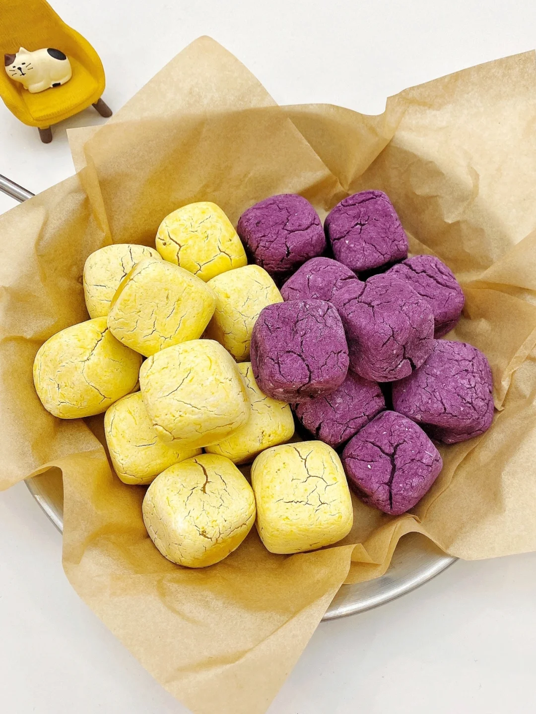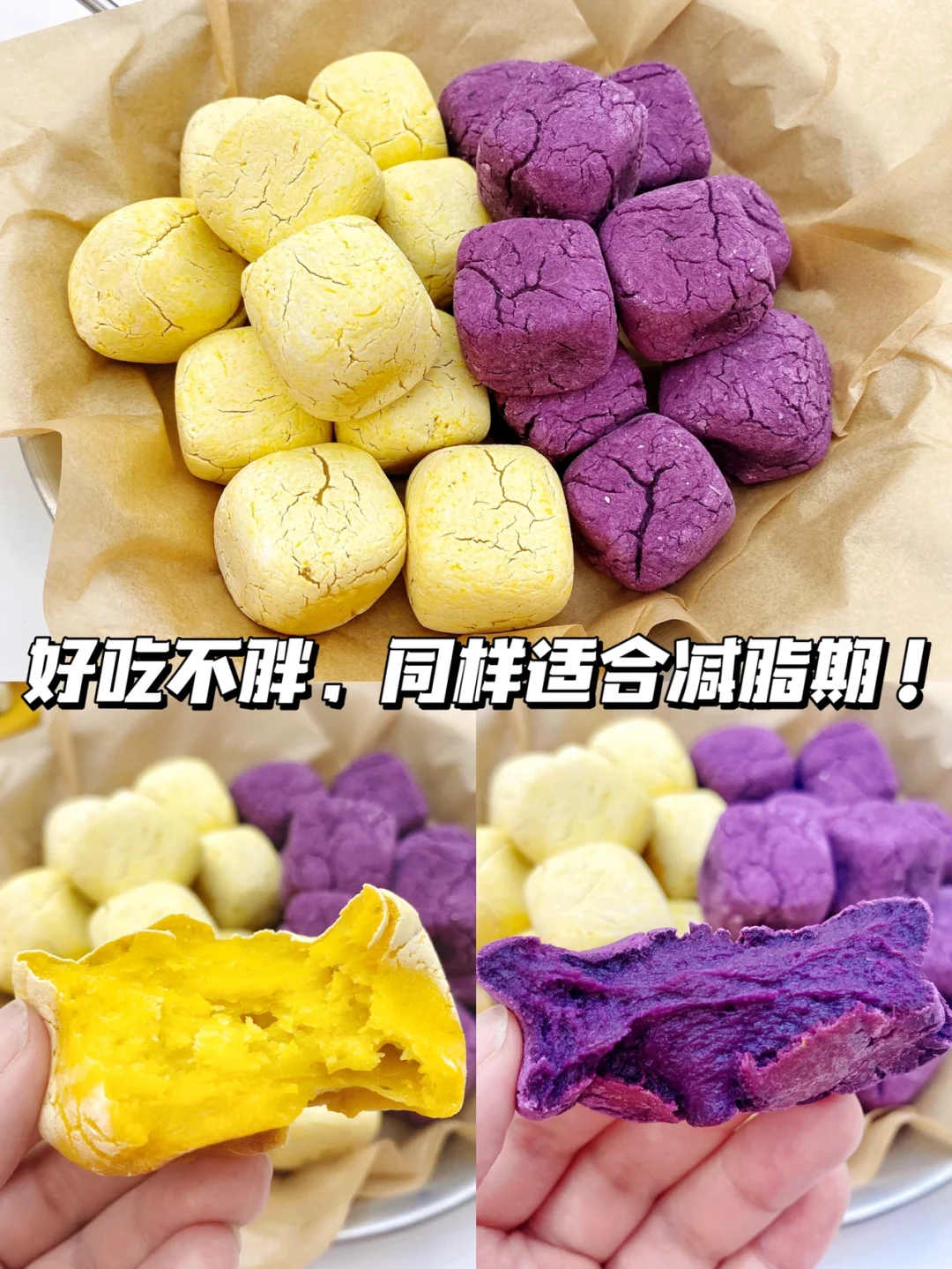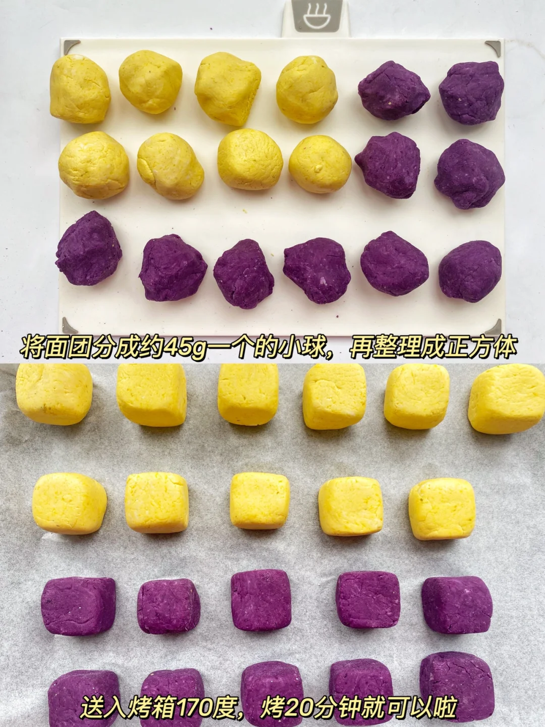🟣脆皮紫薯小方:紫薯200克、糯米粉80克、白糖20克、牛奶或清水 30克(紫薯比较吸水,揉面团的时候要根据吸水程度适量添加)