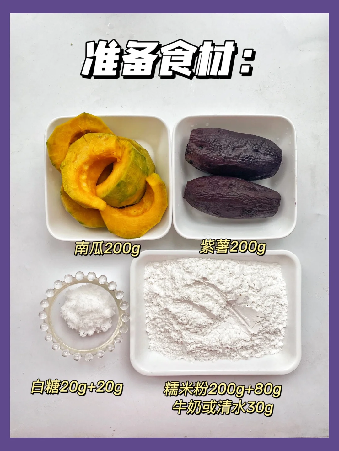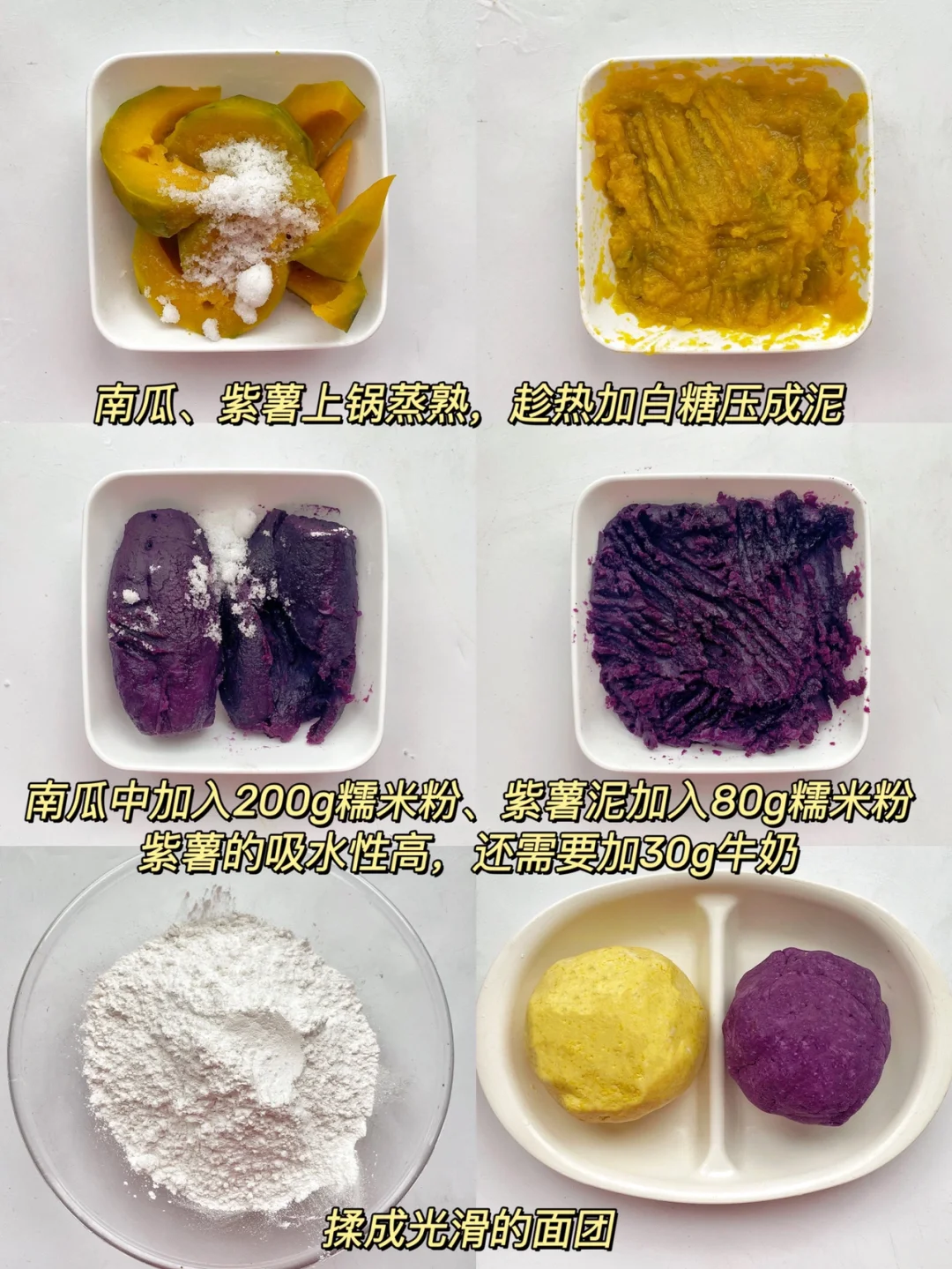 1.南瓜、紫薯去皮蒸熟,趁热加白糖压成泥,分别倒入糯米粉揉成光滑的面团。