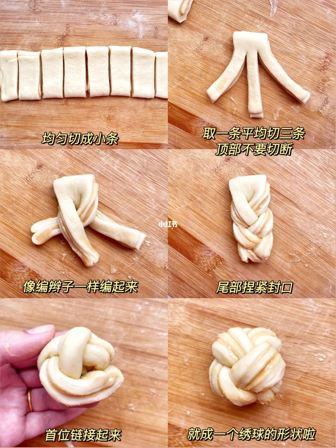 4⃣️把面皮从上到下折到三分之一处。最下面再折到上面,擀面杖略微擀匀。平均切成小段。取其中一段,平均切成三条,像编辫子一样,底部捏紧,反过来,背面收紧,依次做好所有面团,放到模具里,进行二次发酵。二次发酵大概半小时左右,面包明显变大。