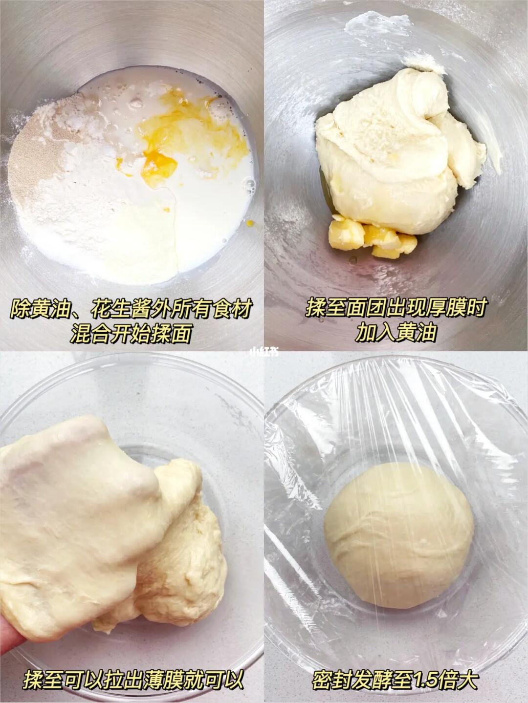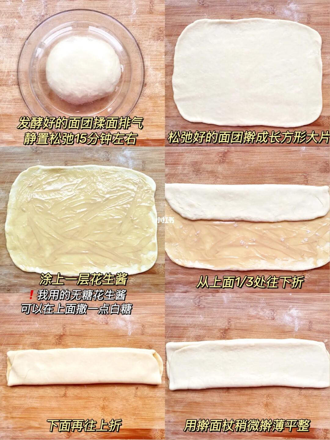 3⃣️发酵好的面团取出按压排气。擀成大片,大约 30*50,均匀刷上花生酱,我用的是宝宝无糖花生酱,喜欢甜的可以换成甜味花生酱或者撒一点糖。