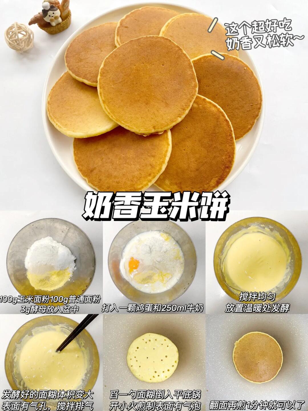 🌟奶香玉米饼,这个真的建议所有妈妈都去做,太太太好吃了❗️浓浓的奶香和玉米味,口感松松软软,刚出锅宝宝就吃掉两个。一定要用平底不粘锅来做哦!
