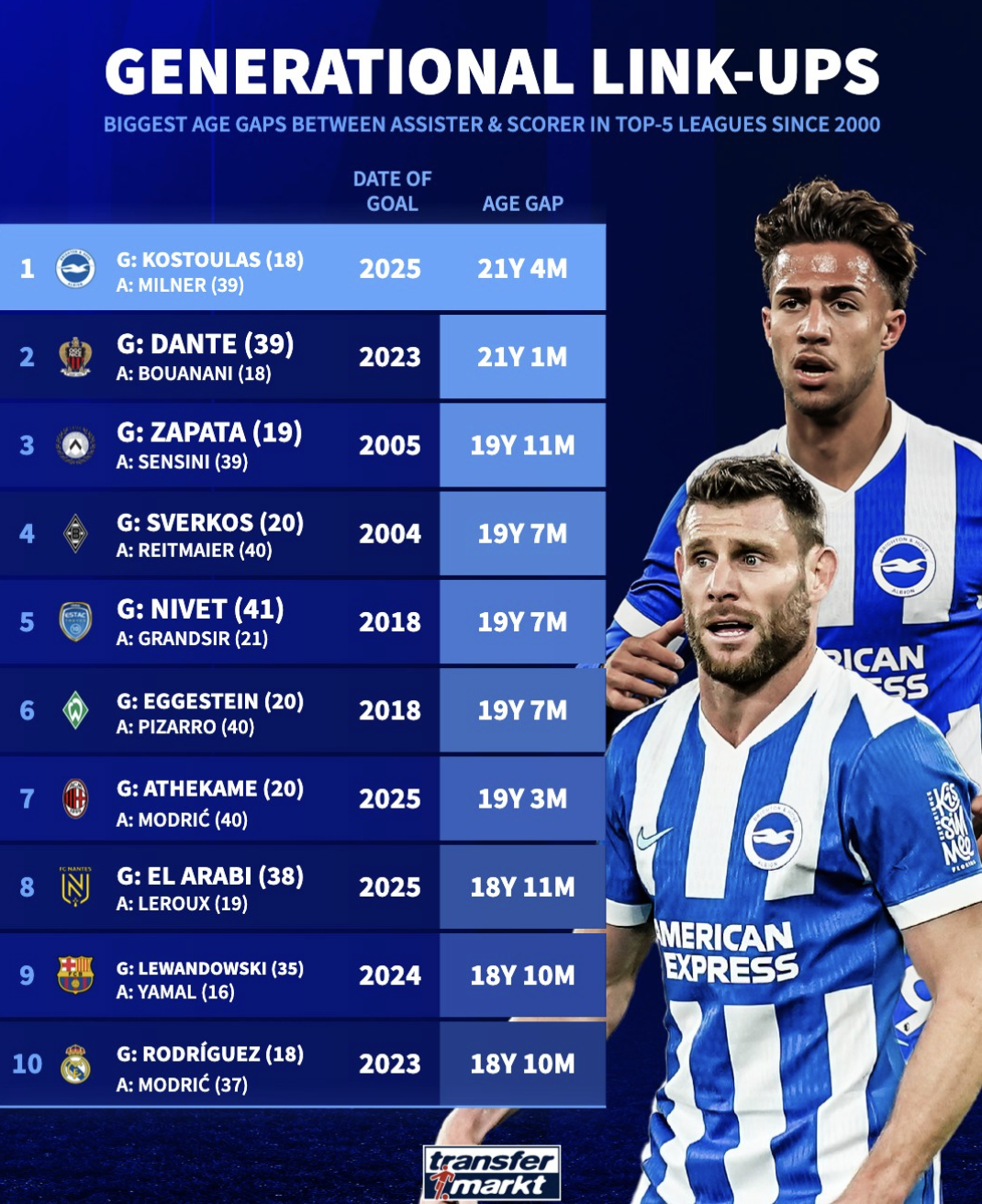 刚刚在英超第九轮为布莱顿进球的科斯托拉斯&米尔纳组合以21岁4个月的年龄差创造历史,排名第一。