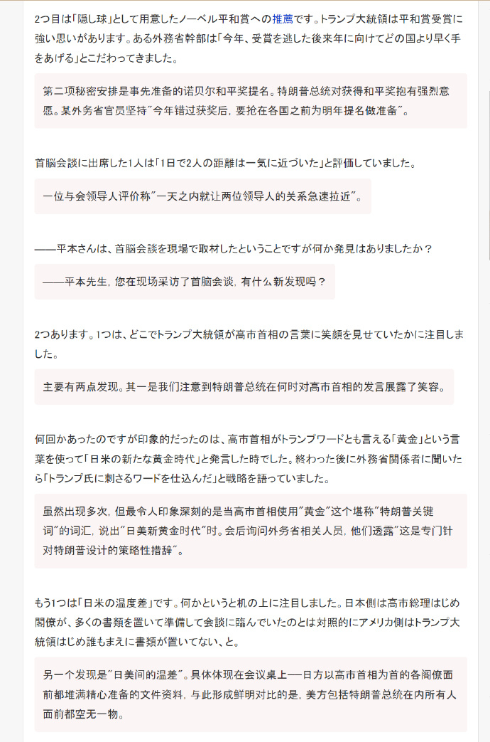 🔻据美日峰会现场人士透露,高市早苗表示要推荐特朗普获和平奖,此举让特朗普"大吃一惊",因此"两人的关系在短短一天内迅速拉近"。