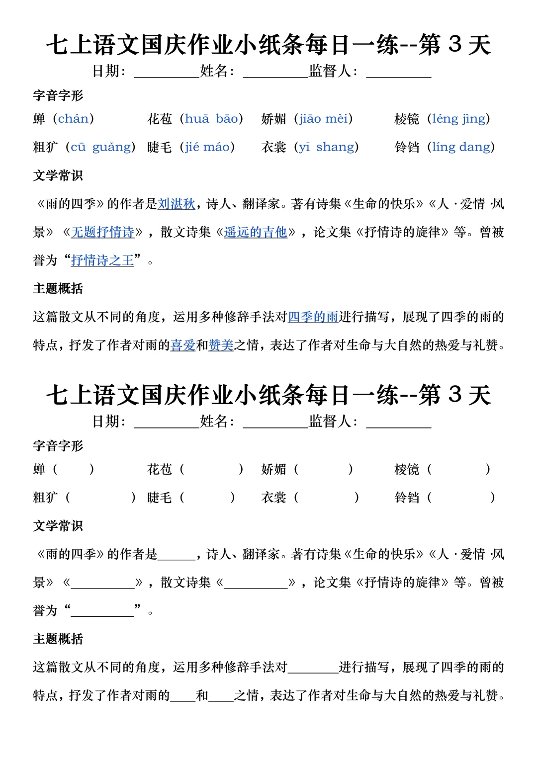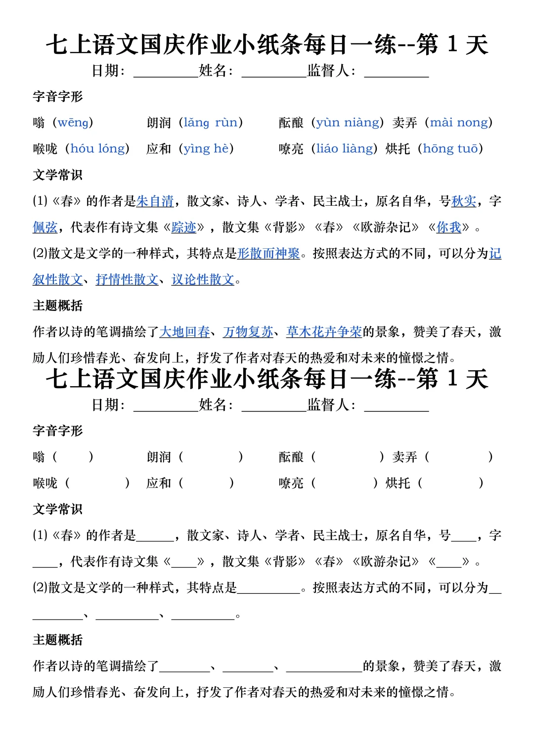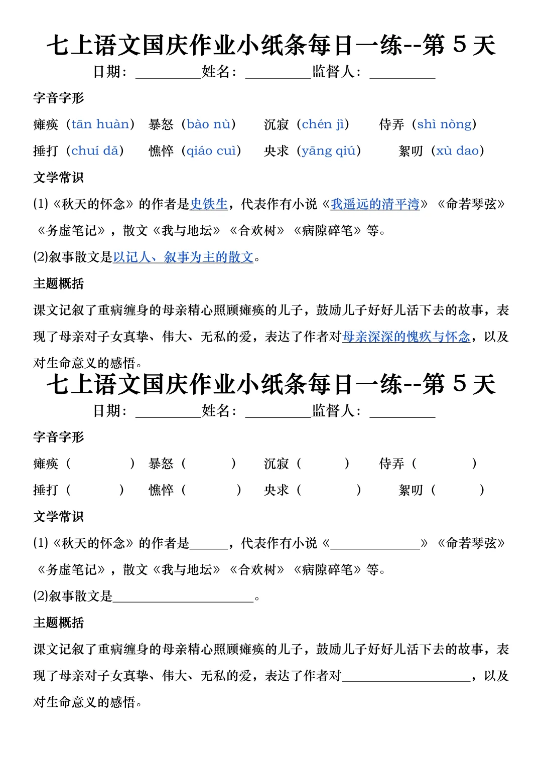 七年级上册 七年级上册语文 七年级语文 七上语文 初一语文默写小纸条 语文练习 初中语文 家长收藏孩子受益月考国庆作业 每日一练早背晚默