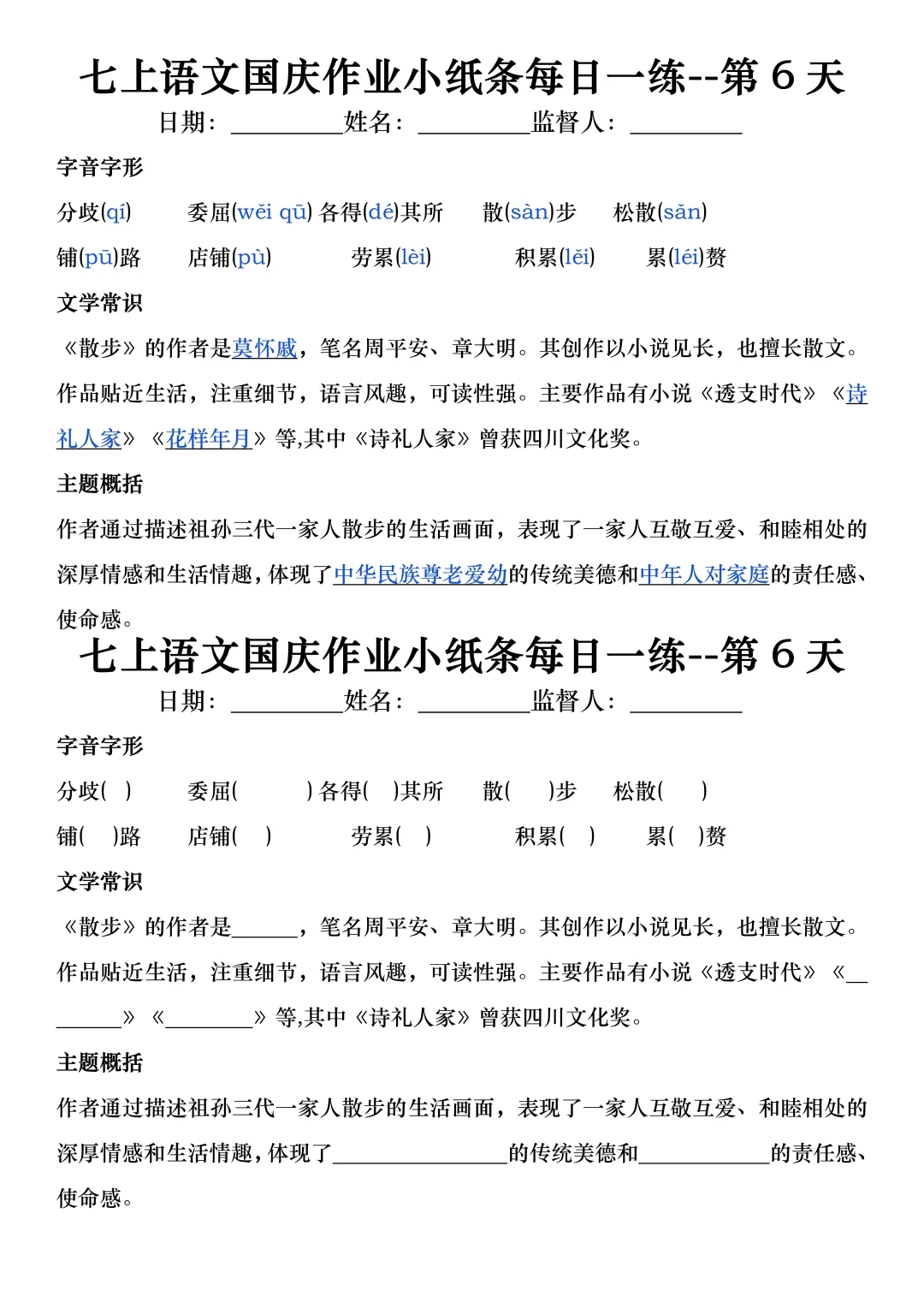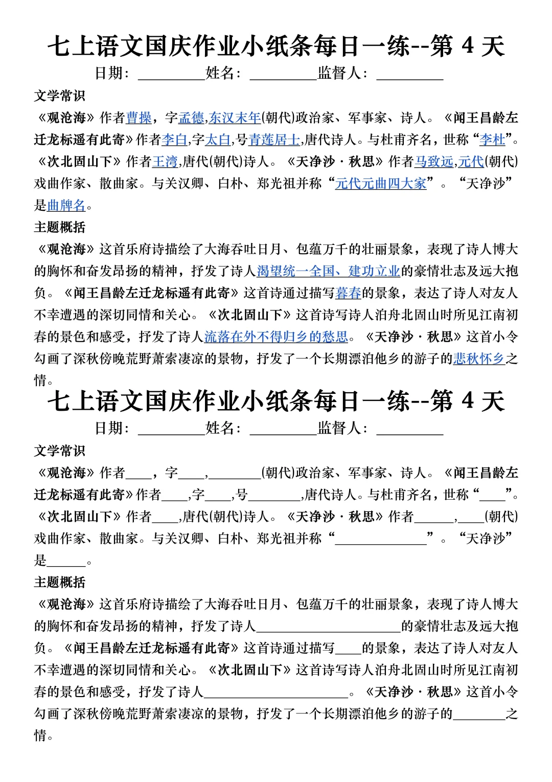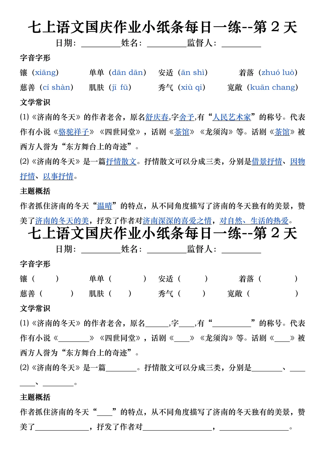 七年级上册 七年级上册语文 七年级语文 七上语文 初一语文默写小纸条 语文练习 初中语文 家长收藏孩子受益月考国庆作业 每日一练早背晚默